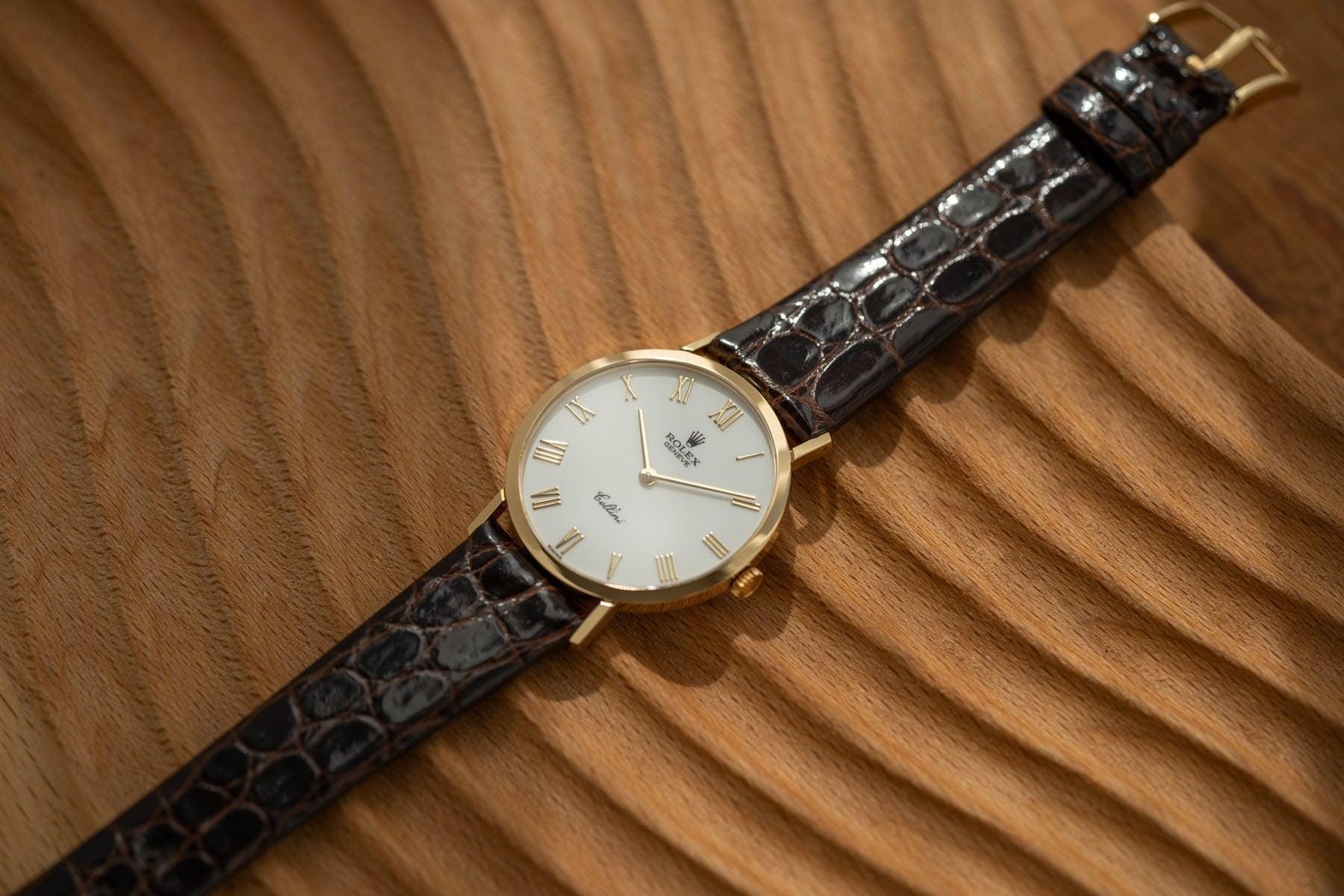 ROLEX Cellini 4112はこれまでも販売してきましたが、YGケースにホワイトのローマンダイアルはこれが初めて。正式な品番(Ref.)は4112/8です。