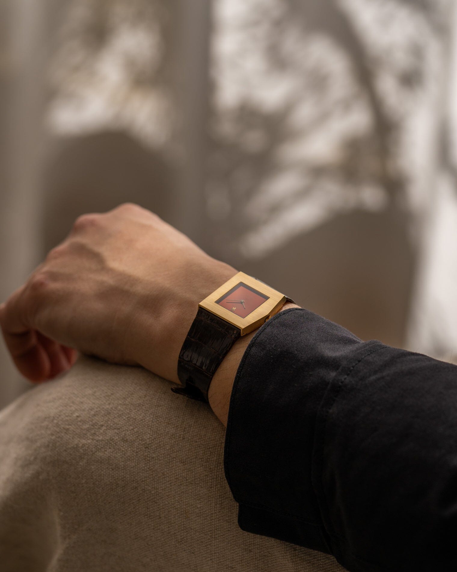 If you place the watch with the 3 o'clock side facing down, you can clearly see the symmetrical case shape that mimics the sloping roof of the Parthenon. Another major feature is that the crown is located on the roof, on the left side of the watch.