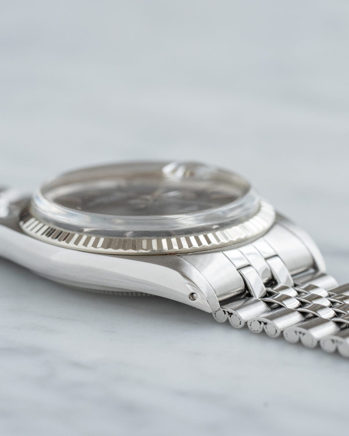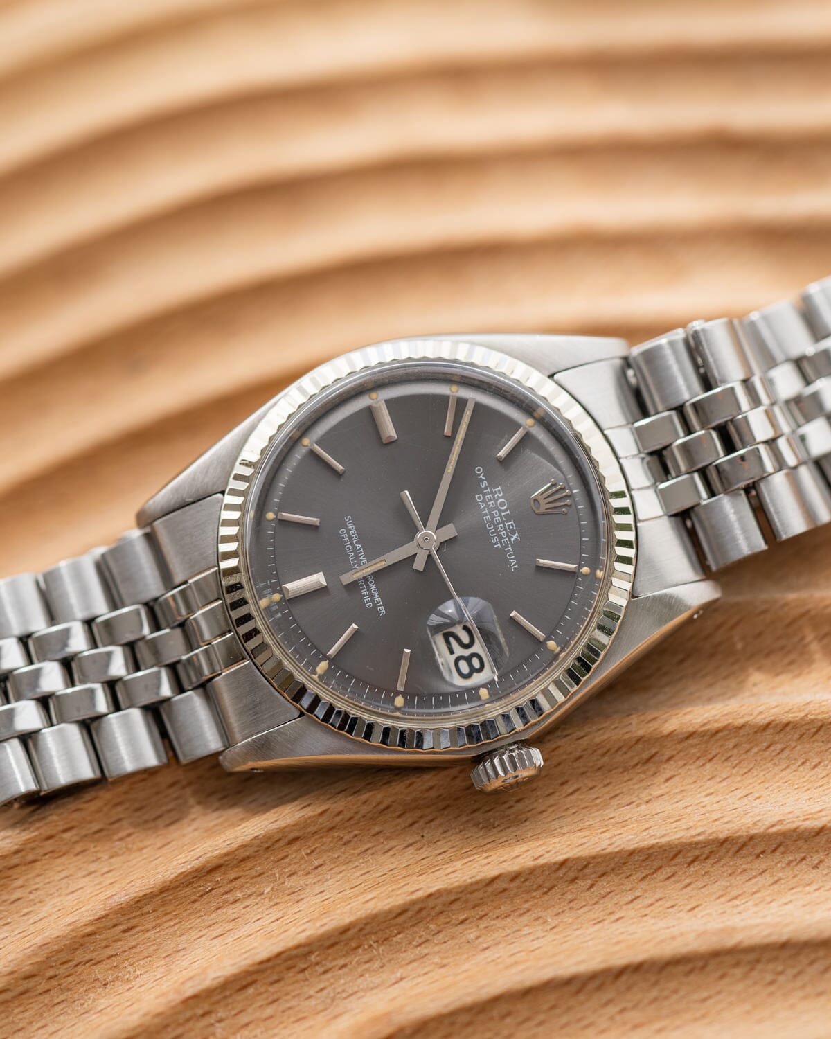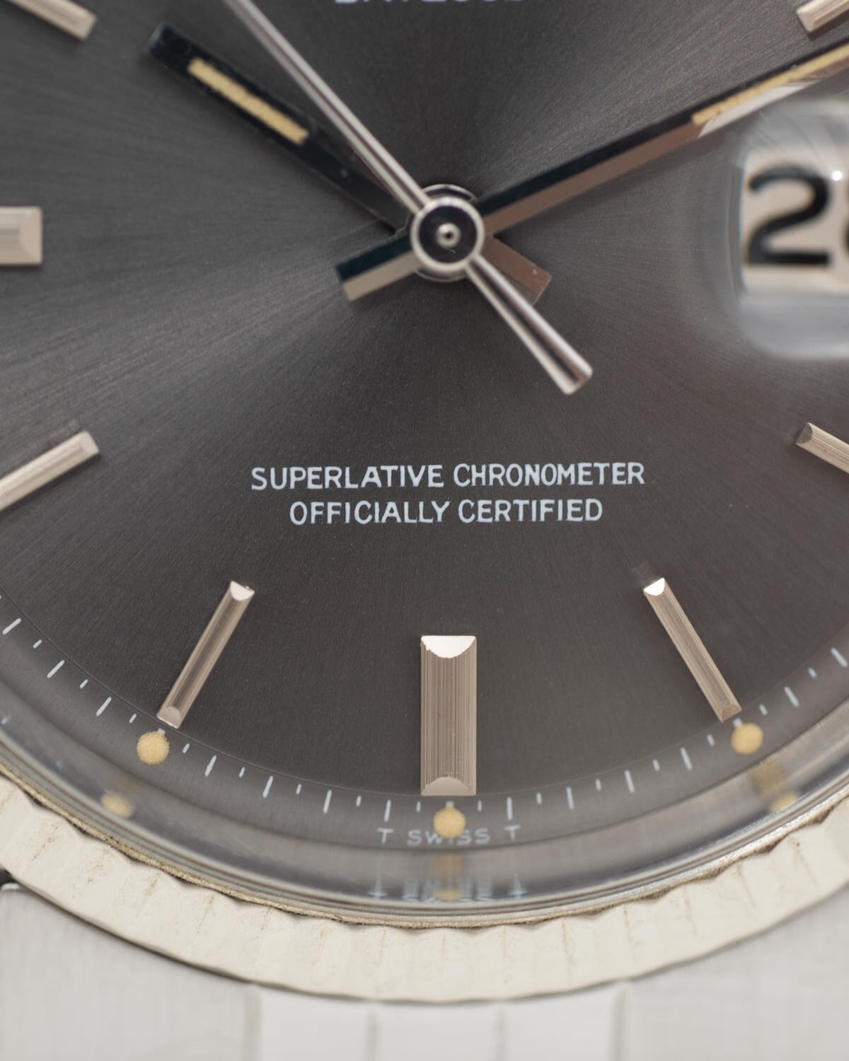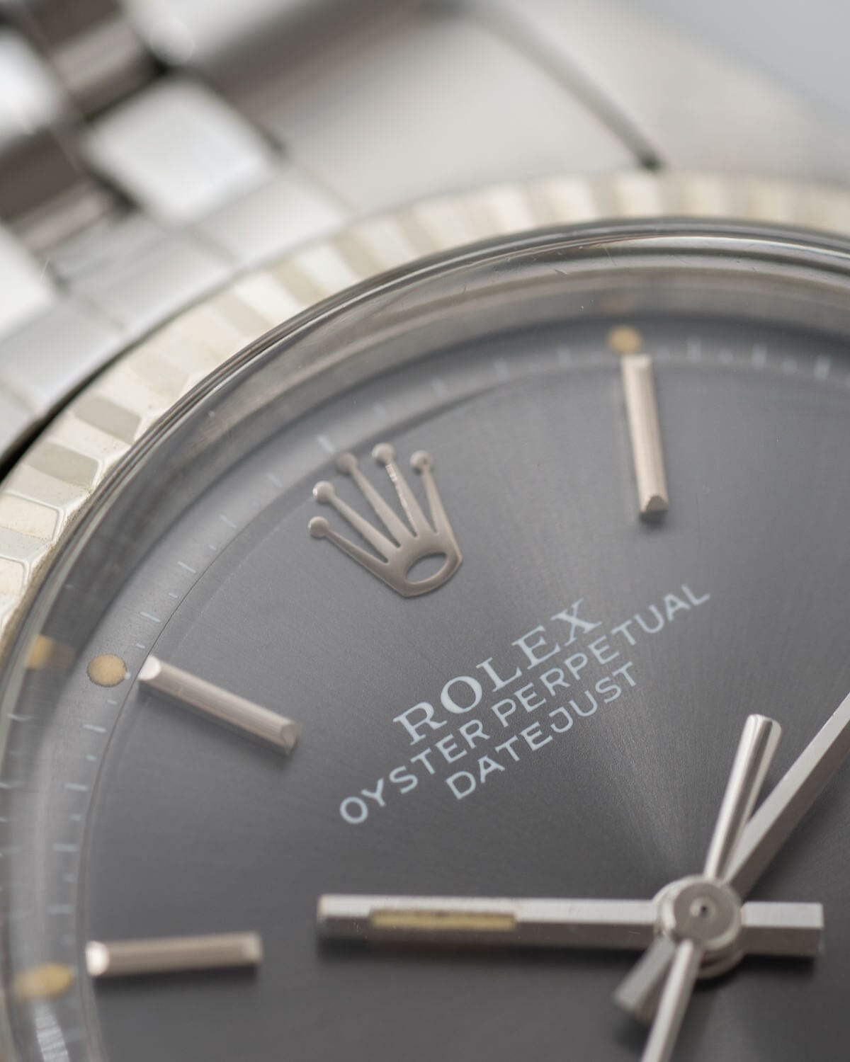 The rounded plexi crystal and the dial with one step down on the outer circumference are details unique to Datejust watches of this age.