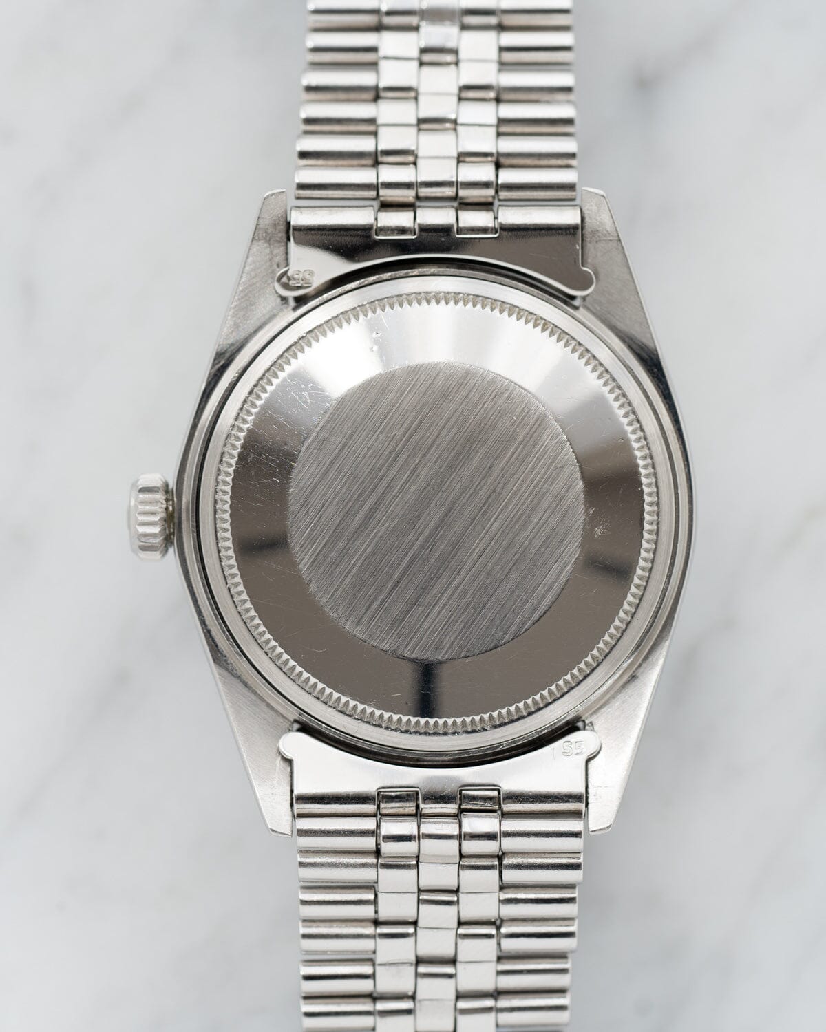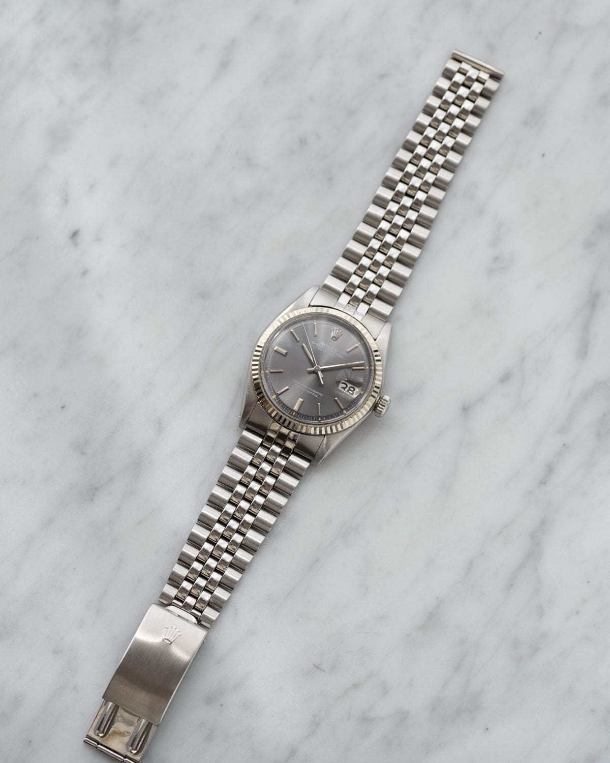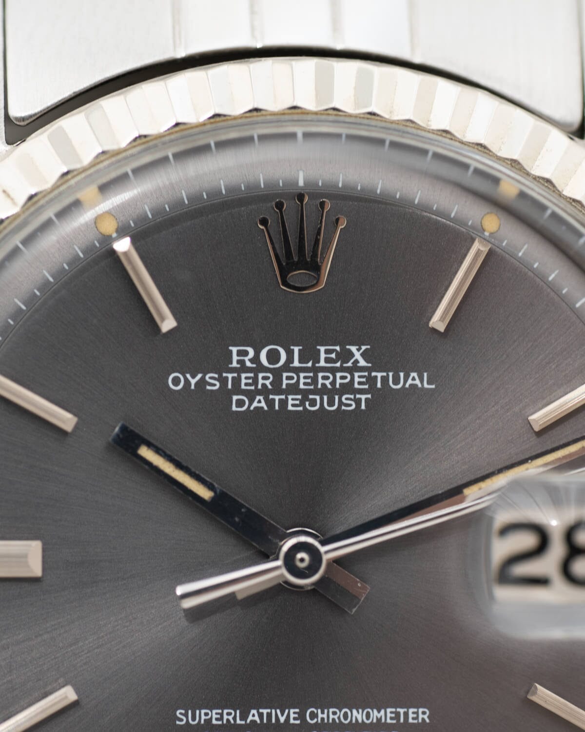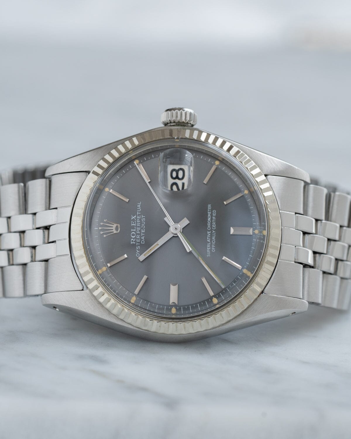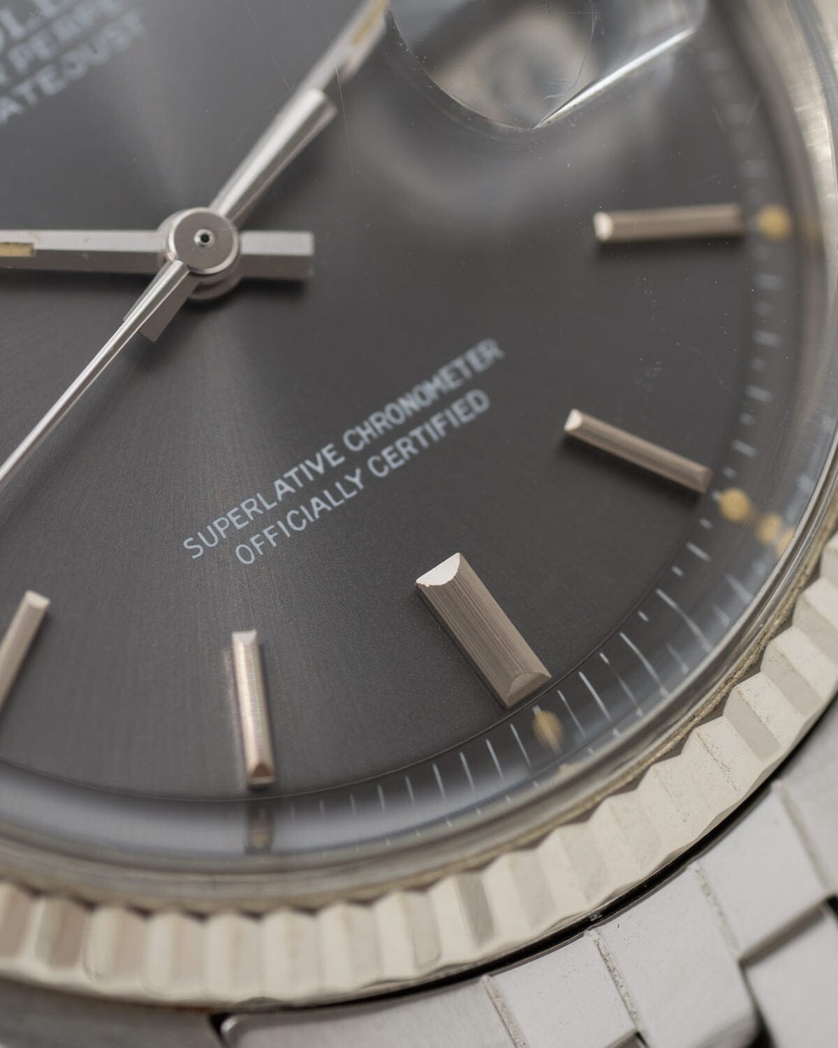 The rounded plexi crystal and the dial with one step down on the outer circumference are details unique to Datejust watches of this age.