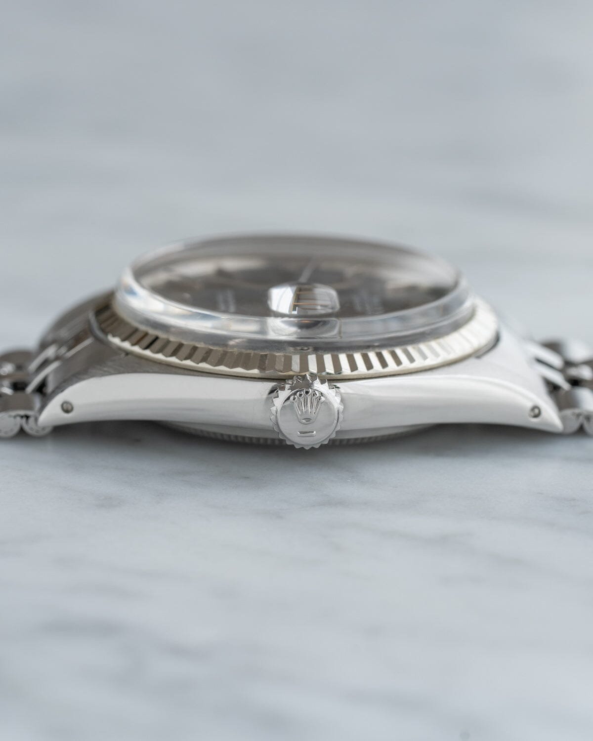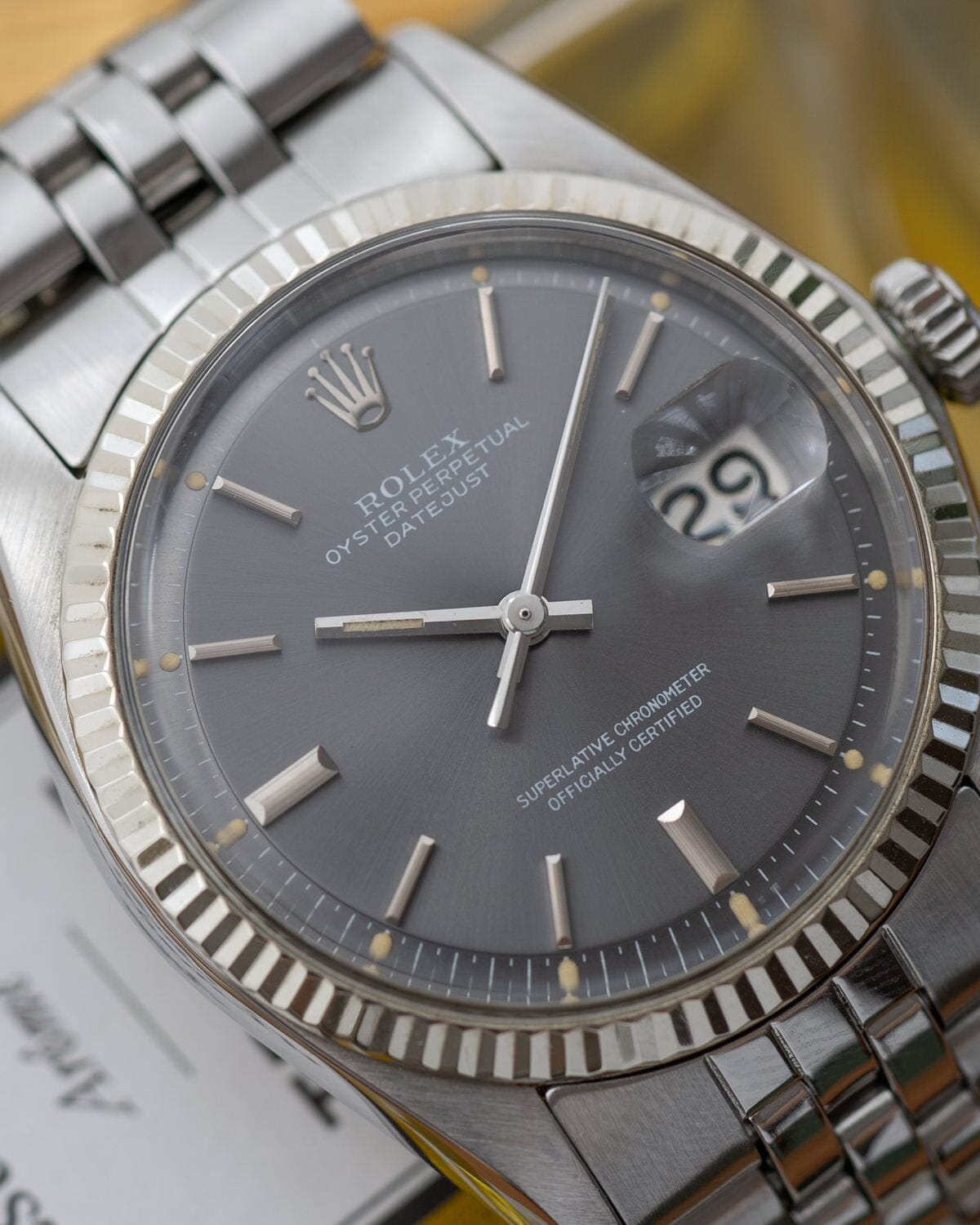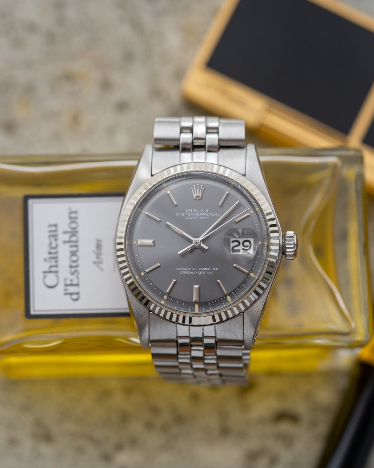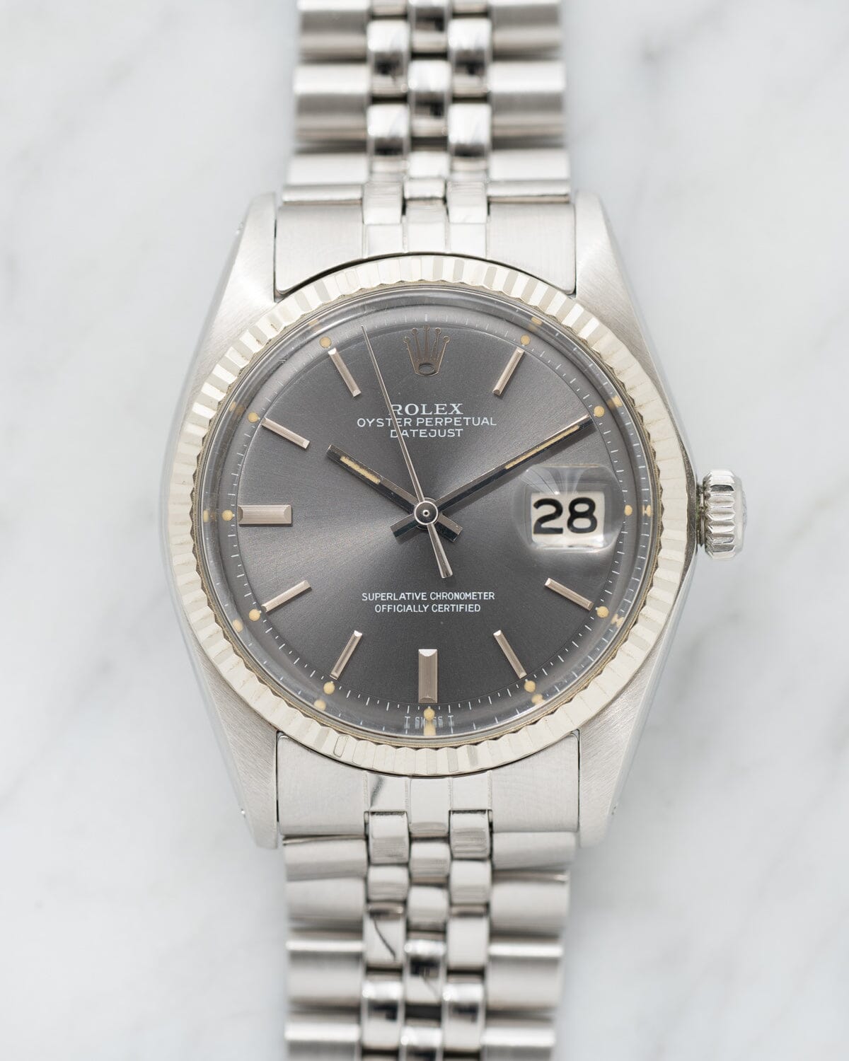 The rounded plexi crystal and the dial with one step down on the outer circumference are details unique to Datejust watches of this age.