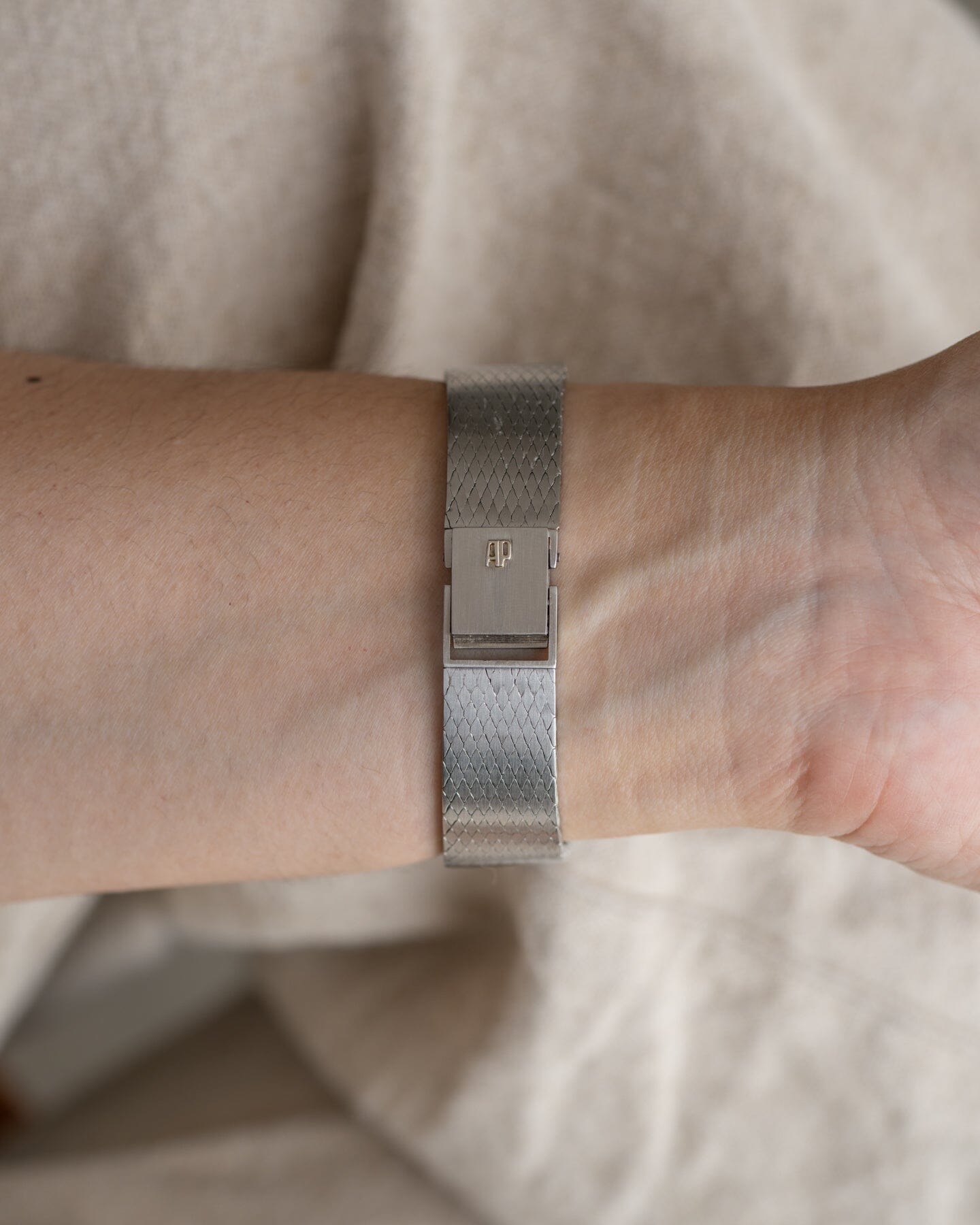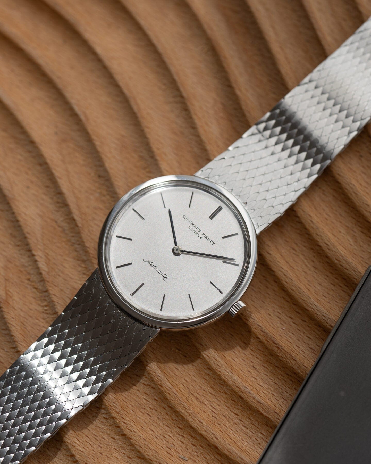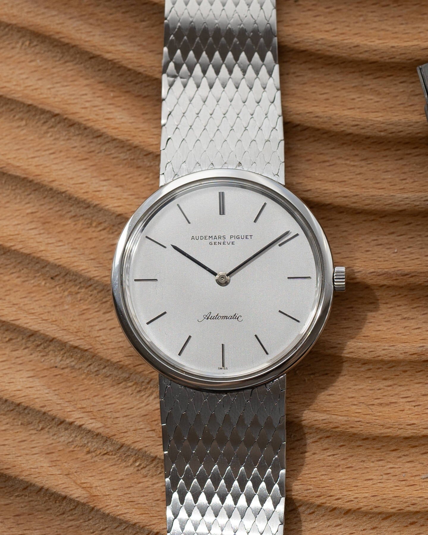 ケースはこの時代のAPの時計としては珍しいステンレススティール製で、しかもブレスレット一体型です。