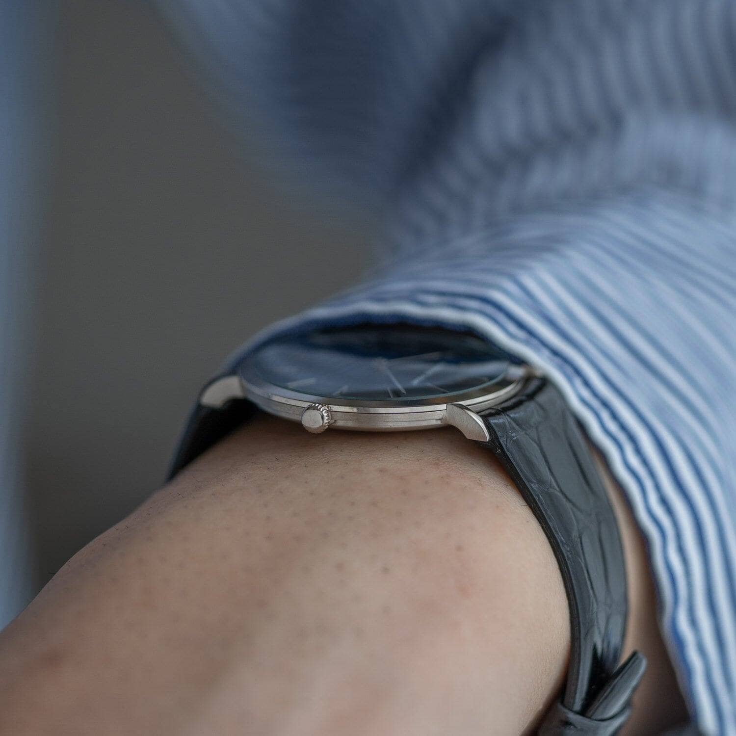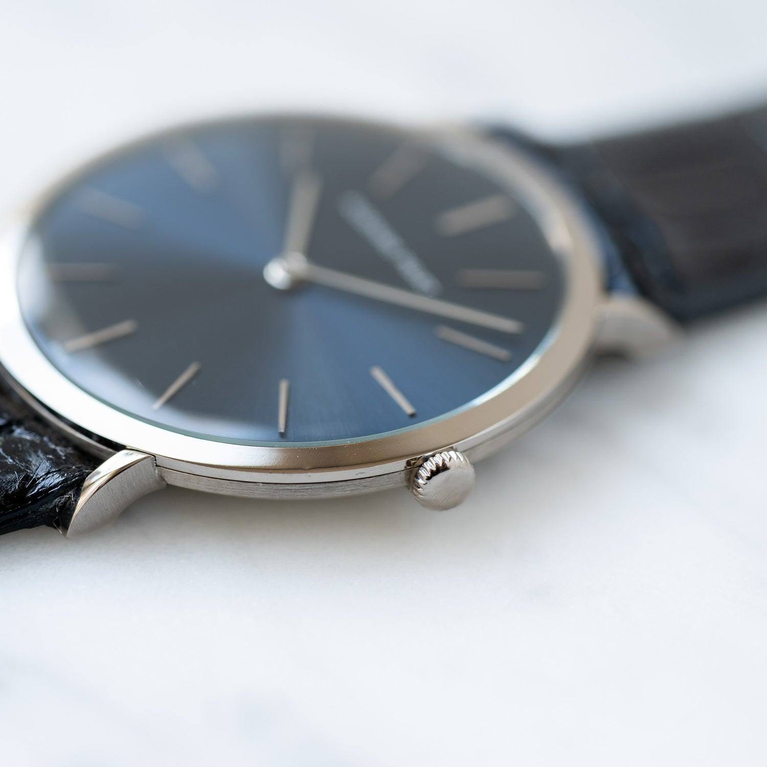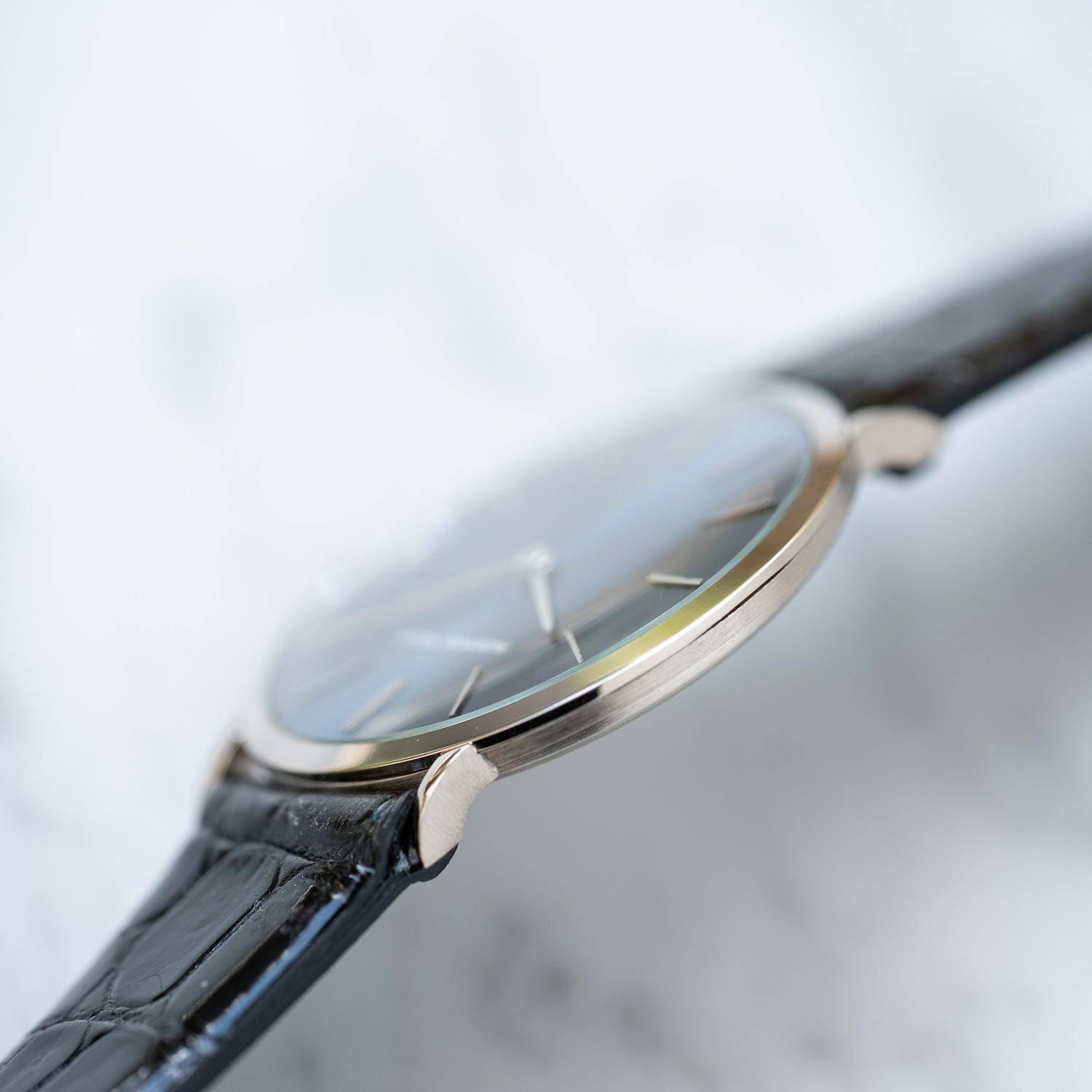 18K ホワイトゴールド製の非常に薄いケースで、フラットなベゼル、横から見ると曲線的なラグが特徴的です。