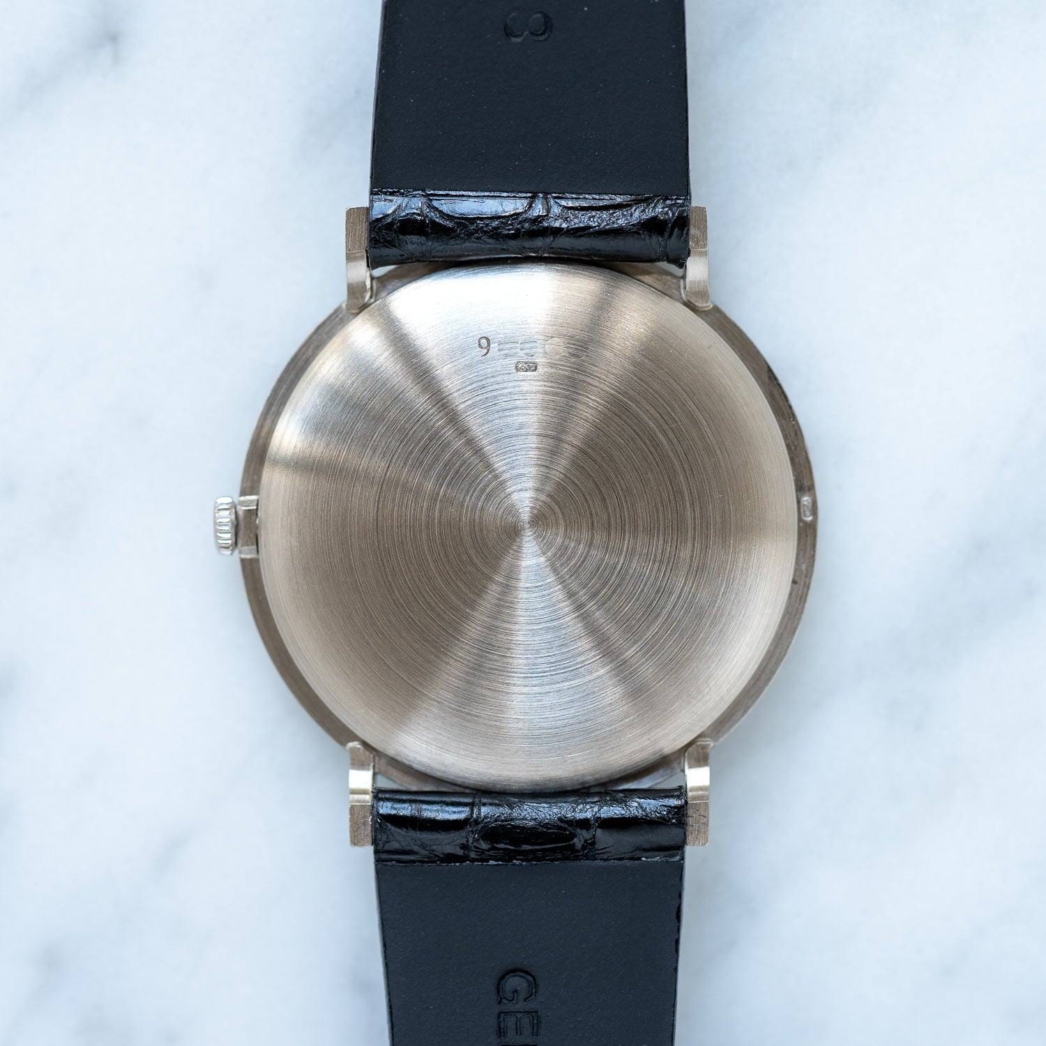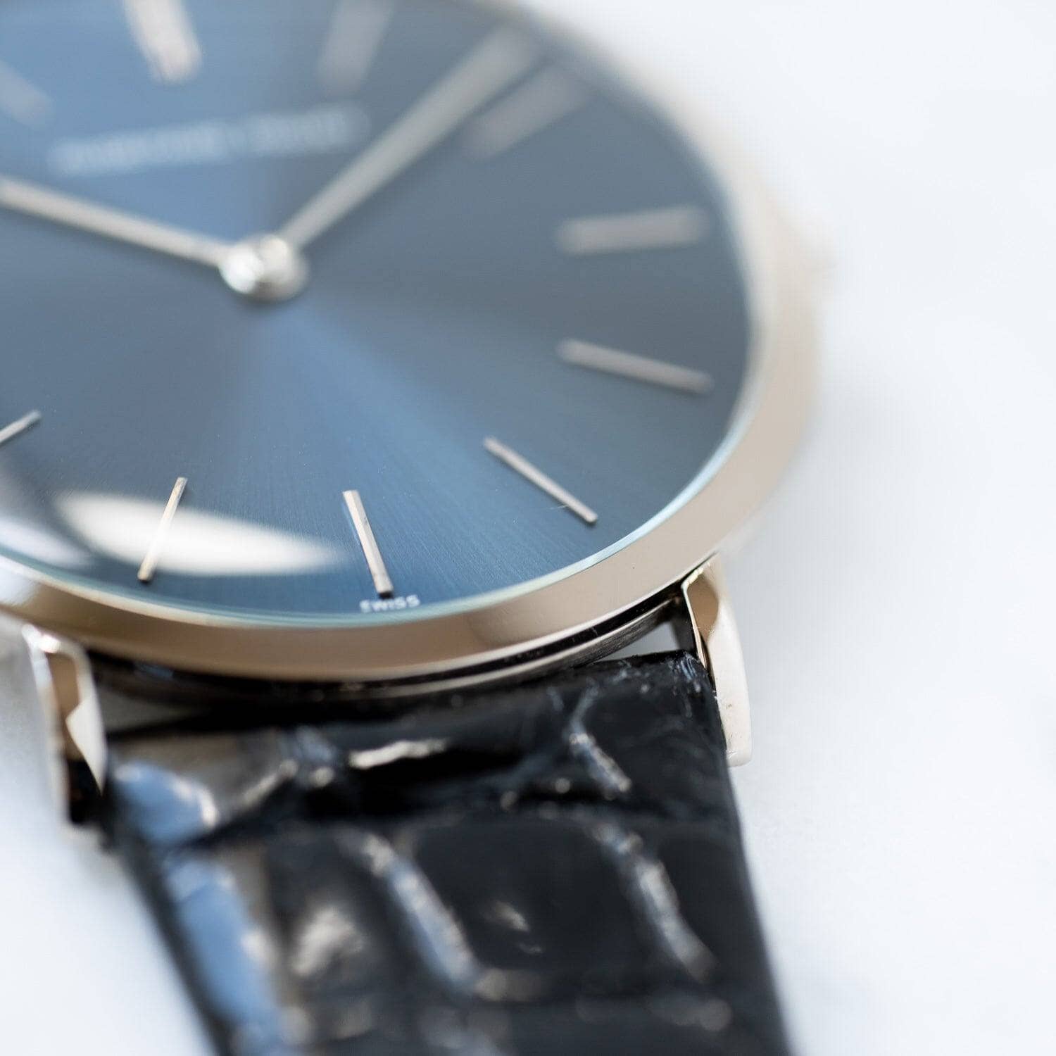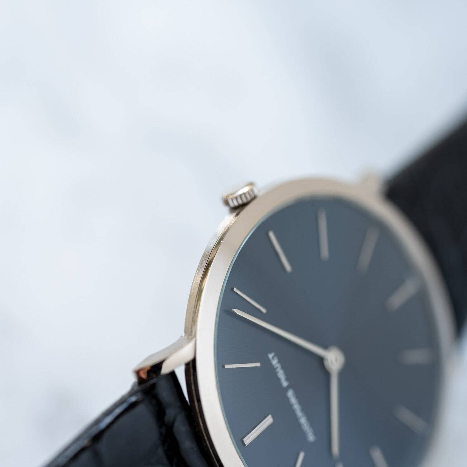 18K ホワイトゴールド製の非常に薄いケースで、フラットなベゼル、横から見ると曲線的なラグが特徴的です。