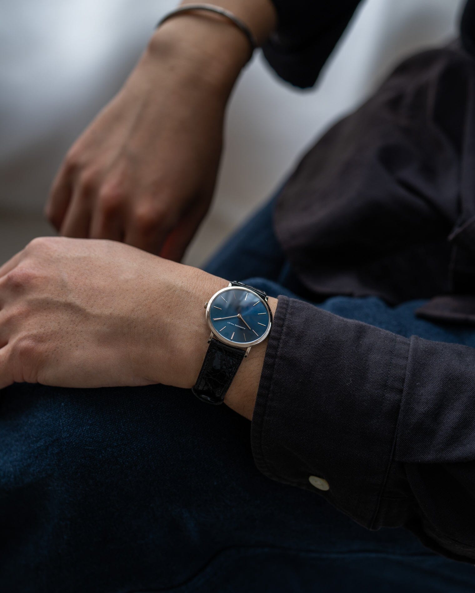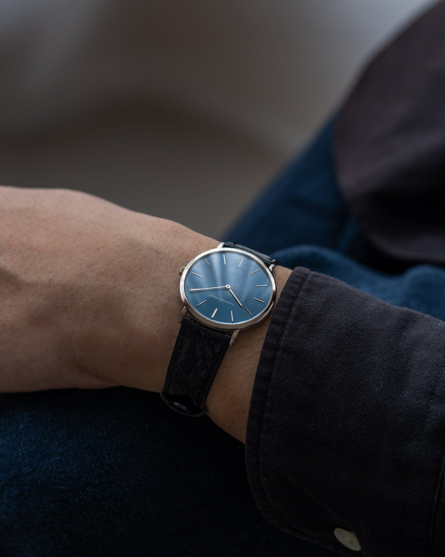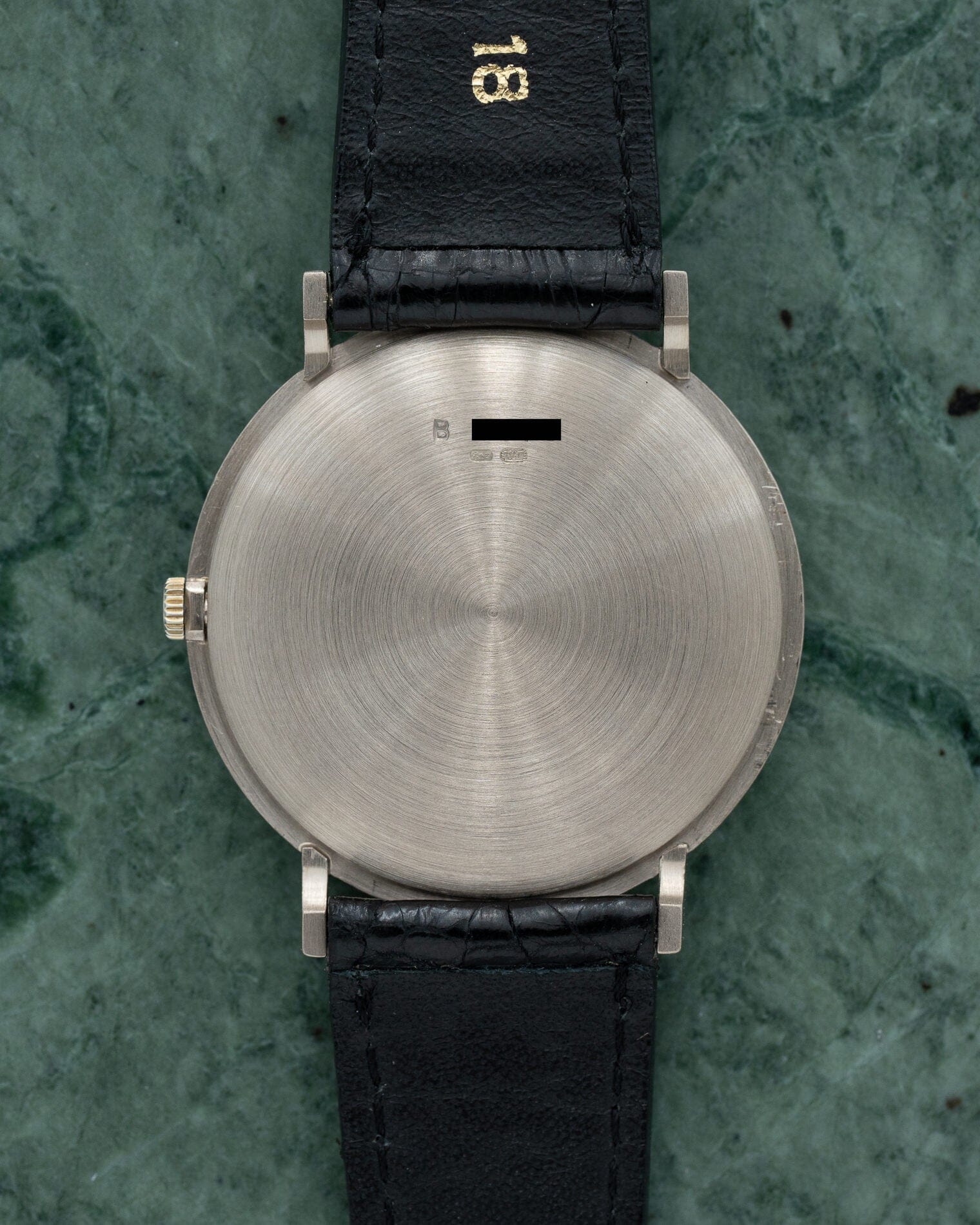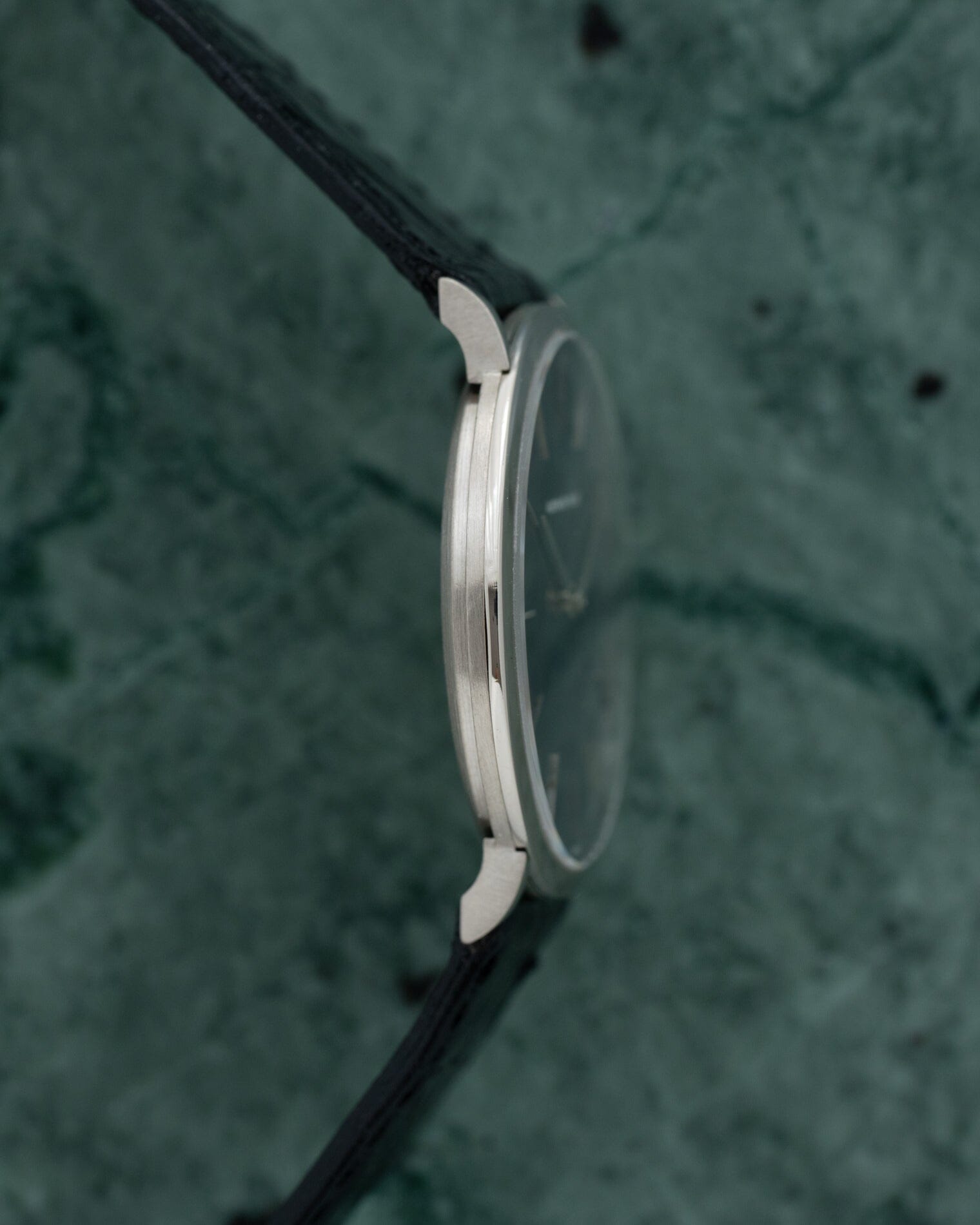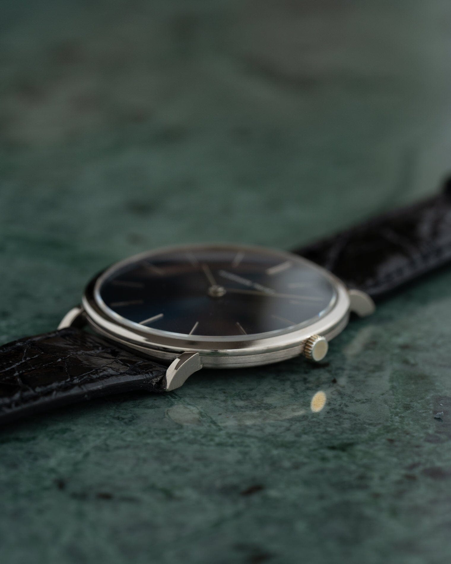 こちらの時計は1970年代製の手巻きのラウンドウォッチ。 18K ホワイトゴールド製の非常に薄いケースで、エクストラフラットと言われることもあります。フラットなベゼルと横から見ると曲線的なラグが特徴的です。