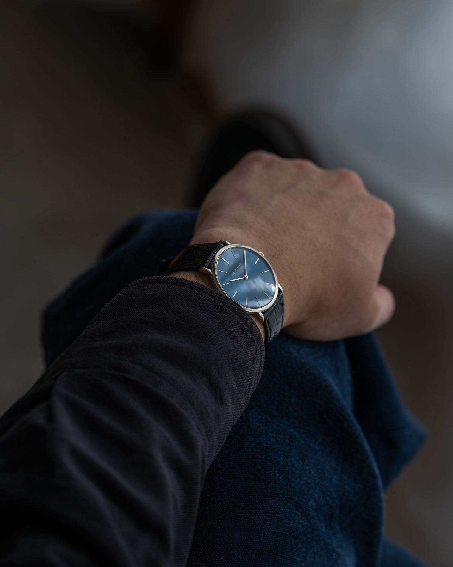 針とインデックスは細いバーインデックスにバトンハンドはケースという非常にシンプルで視認性の高い組み合わせです。これらはケース同じ18Kホワイトゴールド製です。