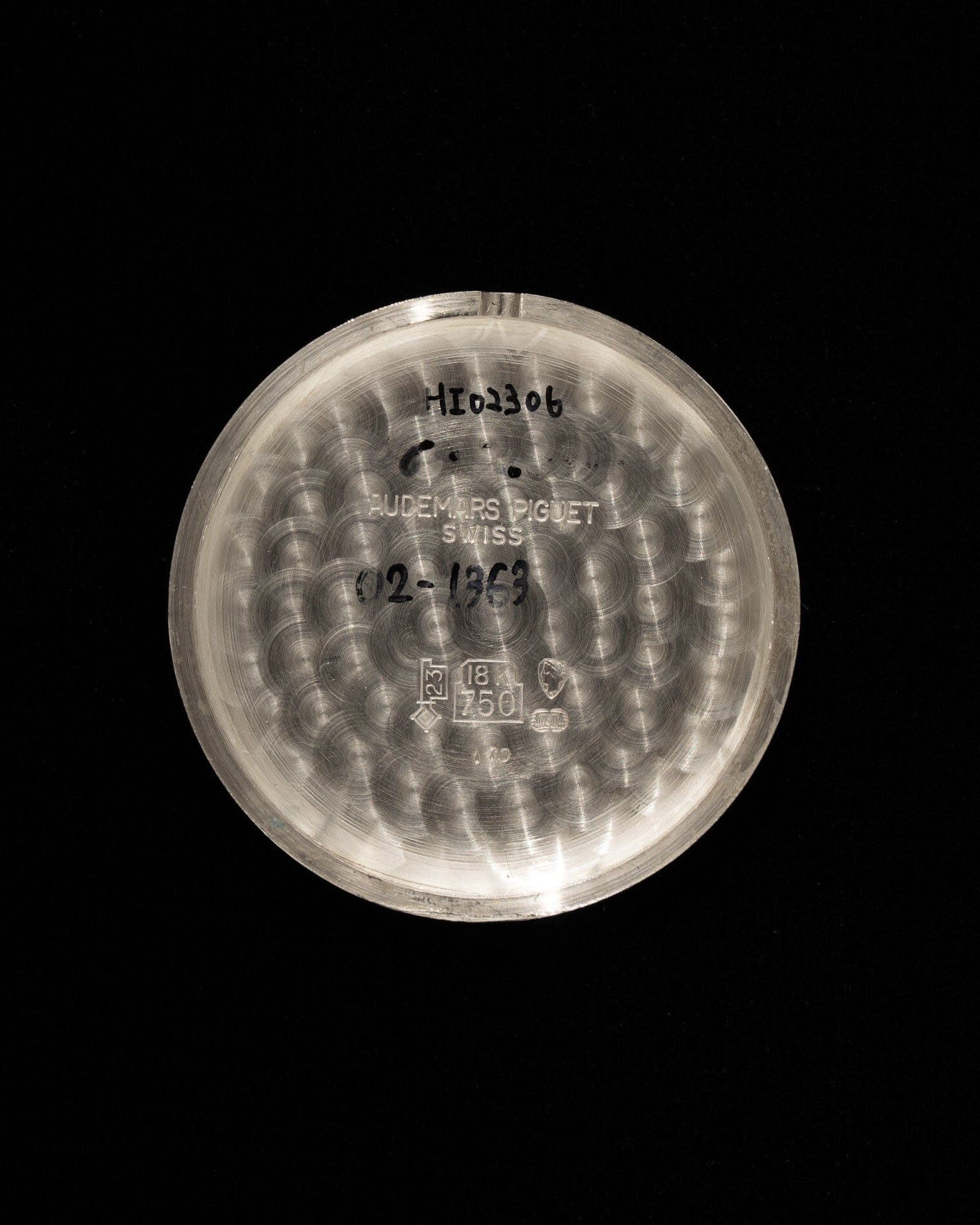 ケース表面はポリッシュ仕上げですが、側面はヘアライン仕上げが施されています。細かい仕上げの違いに拘りが感じられます。裏蓋は同心円状のサテン仕上げが施され、18Kゴールドを示すホールマークも刻印されています。