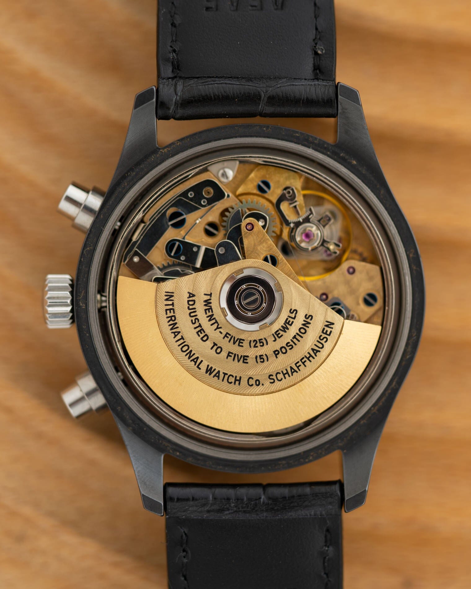 ムーブメントは自動巻きのバルジュー7750をベースにIWCが調整と改造を施したCal.7902。軟鉄製のインナーケースを挟んでゴールド仕上げが施された各部品が非常に美しいムーブメントです。