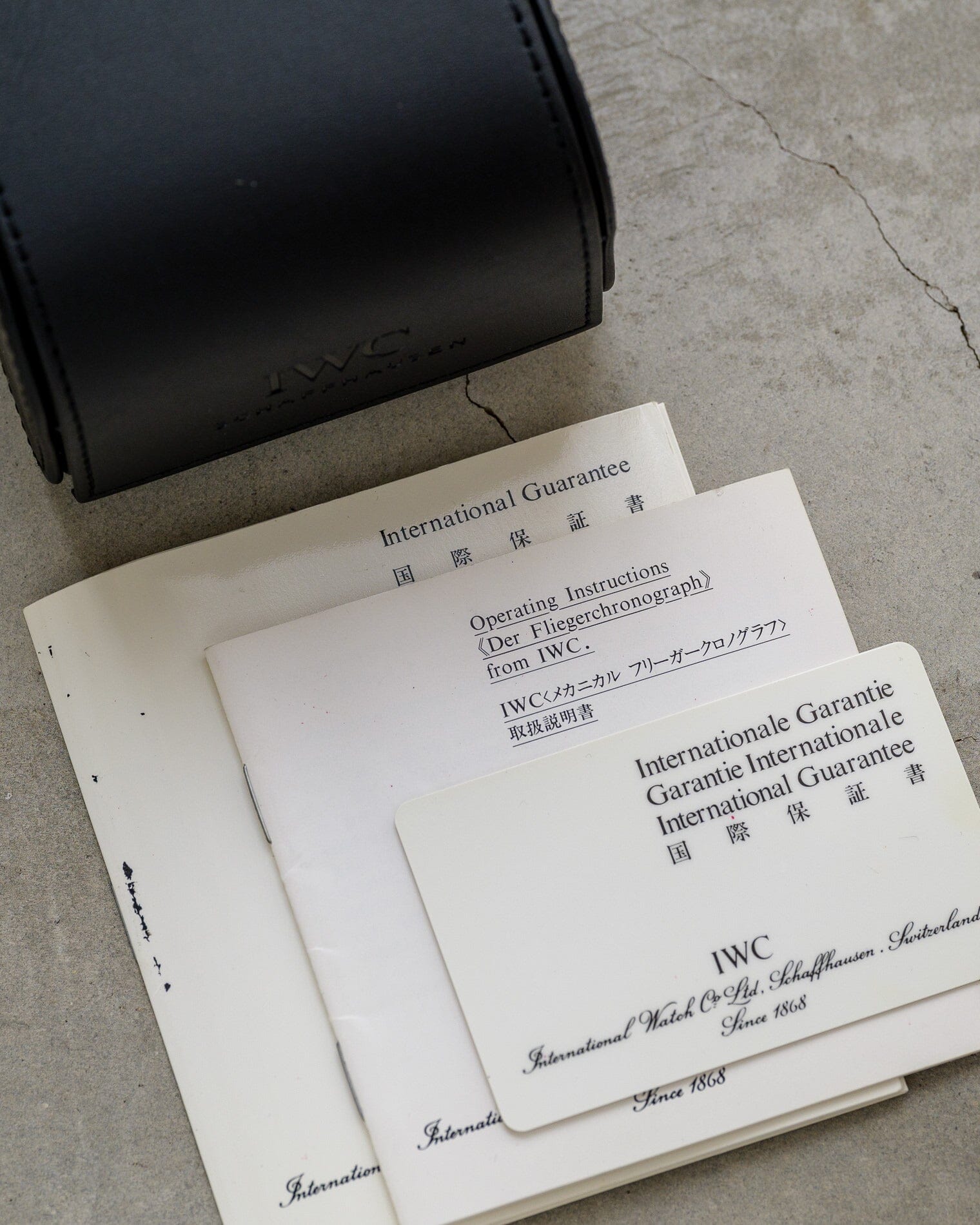 また、IWC純正のレザーベルト、純正のステンレススティール製尾錠、操作説明書の冊子が付属します。