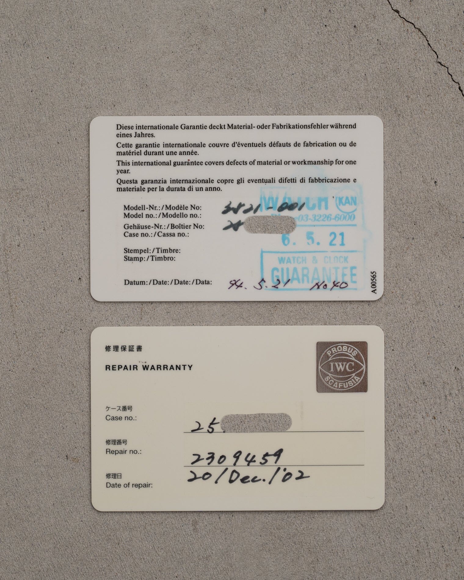 販売時のギャランティカードと2002年にIWCでサービスを行った際の修理保証書が付属します。