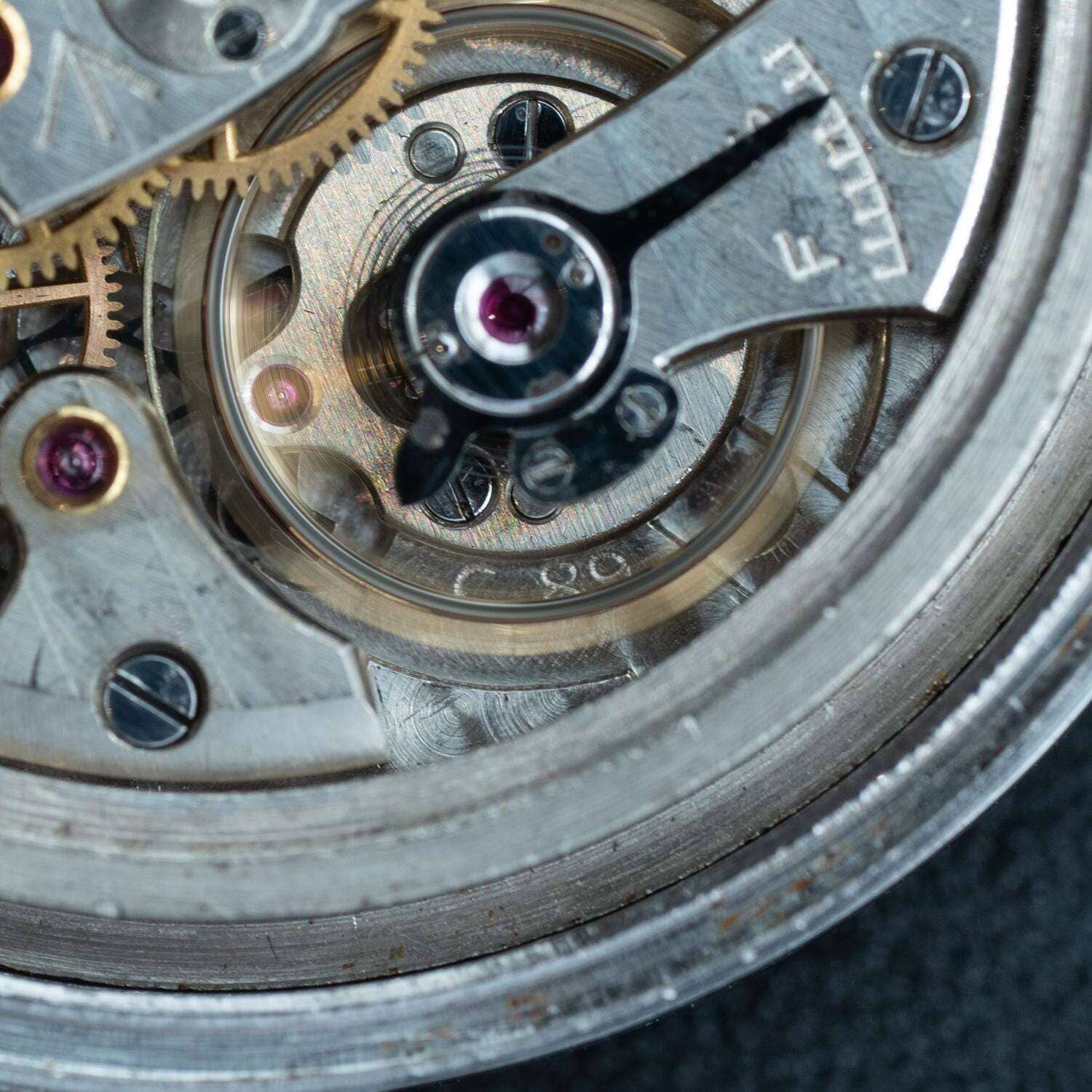 一般的なCal.89にハック機能(秒針規制)を加え、ブロードアローが刻印された特別仕様となっています。