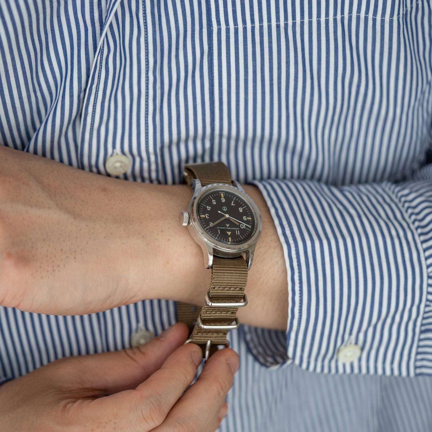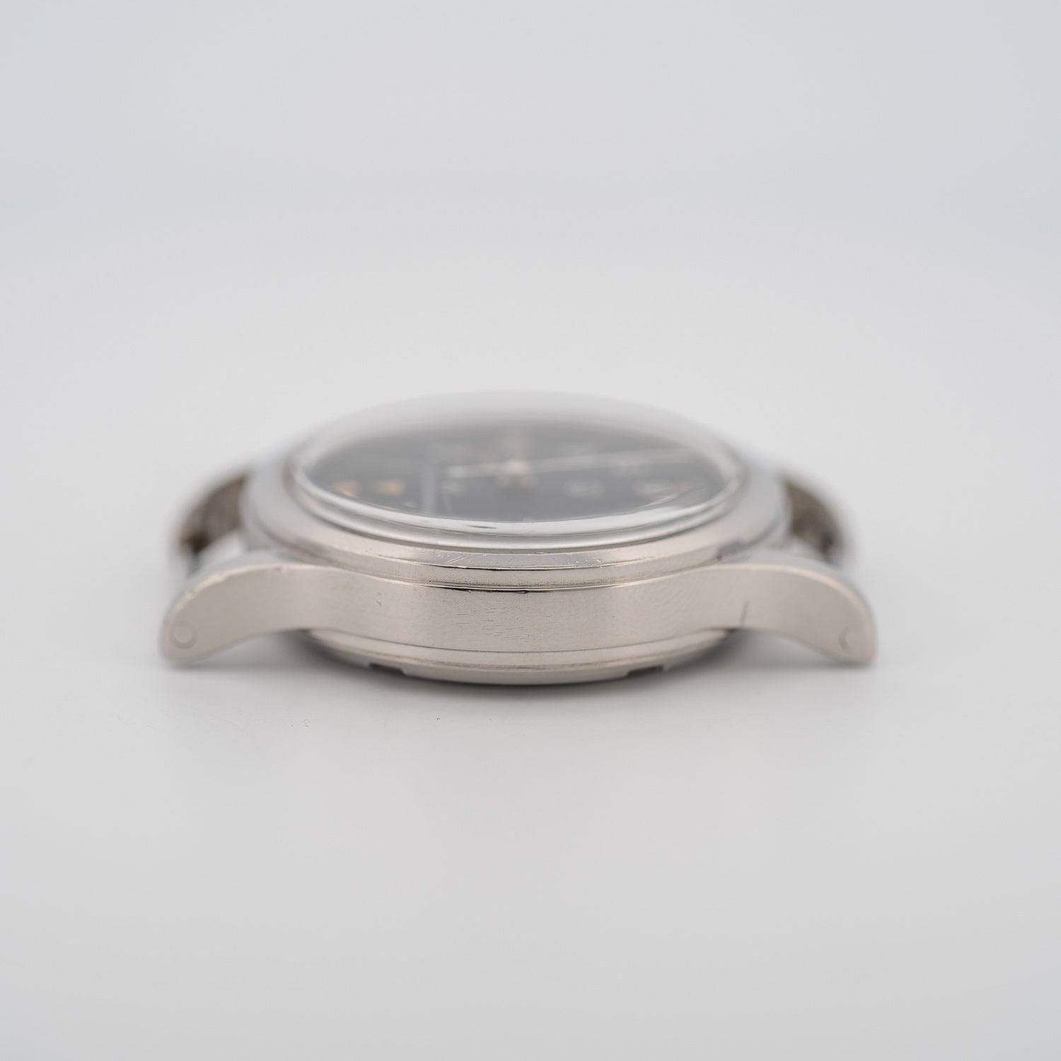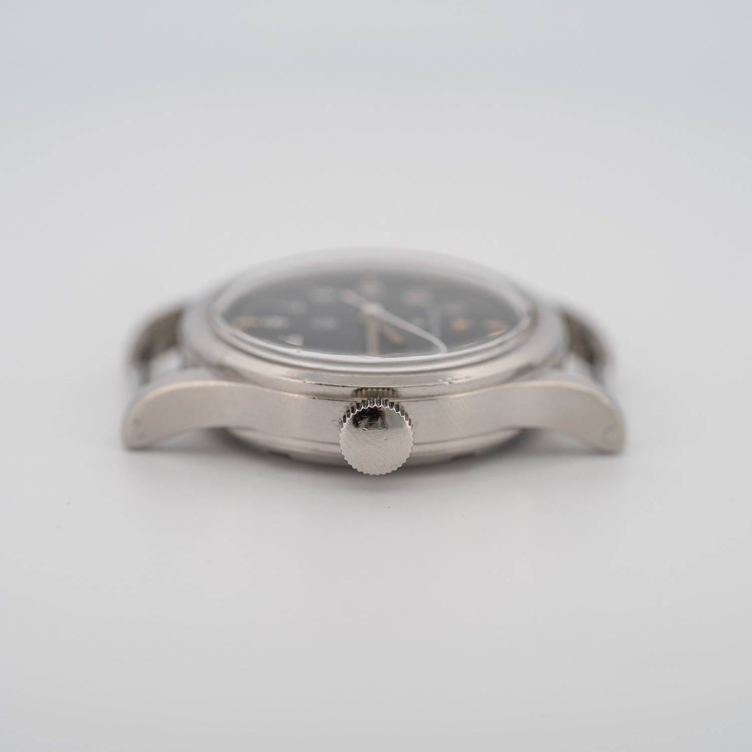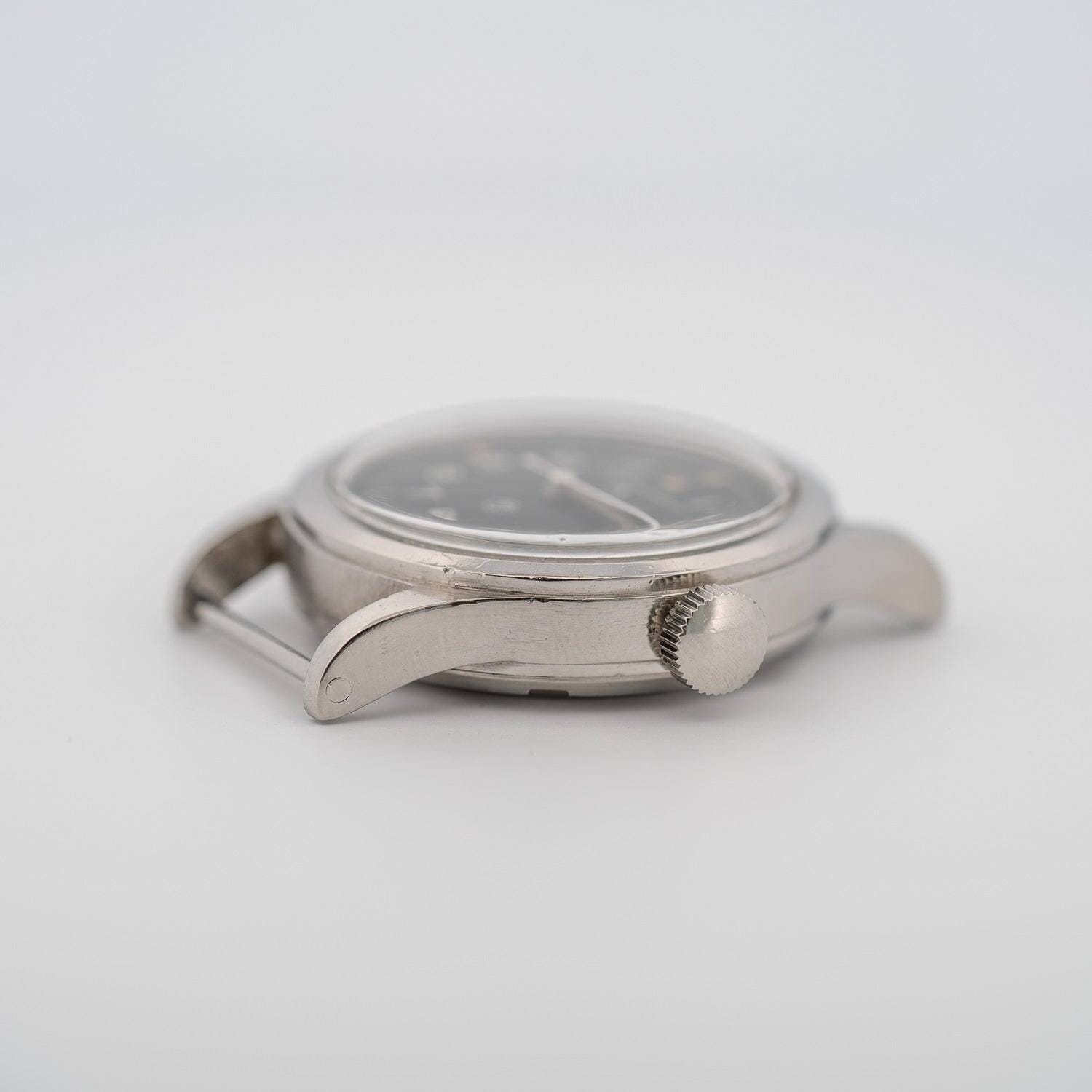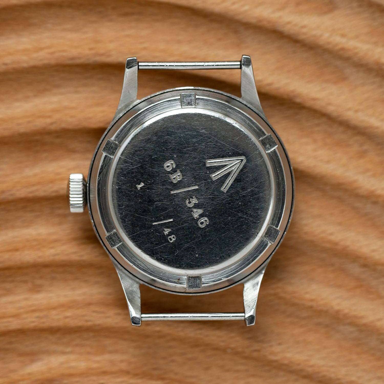 こちらの時計はイギリス空軍に実際に供給されたもので、文字盤と裏蓋にはブロードアローのマークが入っています。