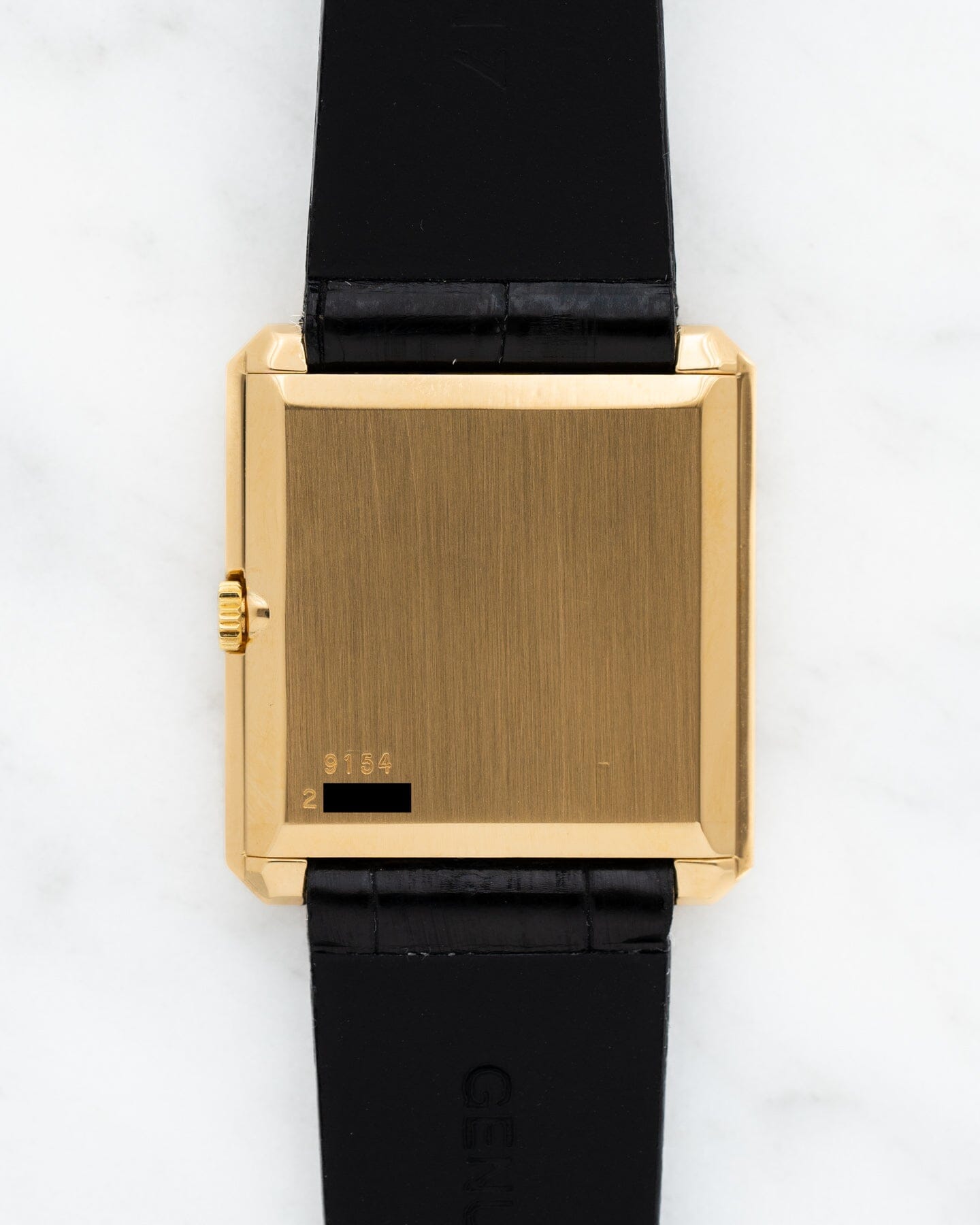 18Kイエローゴールドのケースは正方形に近い形状。ケースの厚さがわずか4mmの超薄型です。