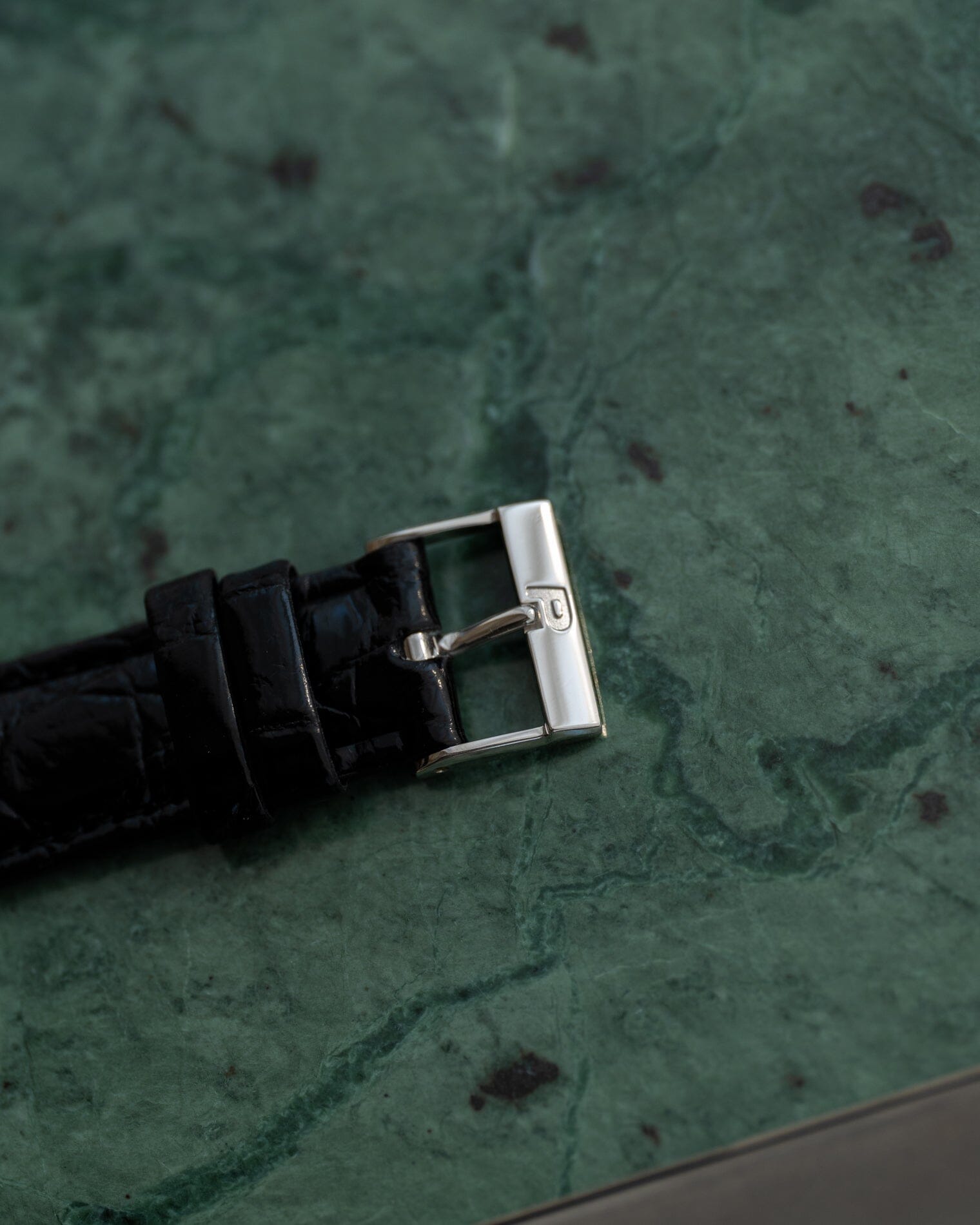 幅広なアルファハンド、PIAGETのプリントとダイヤモンドという白、黒のみの配色がミニマルさとエレガントさを両立させています。