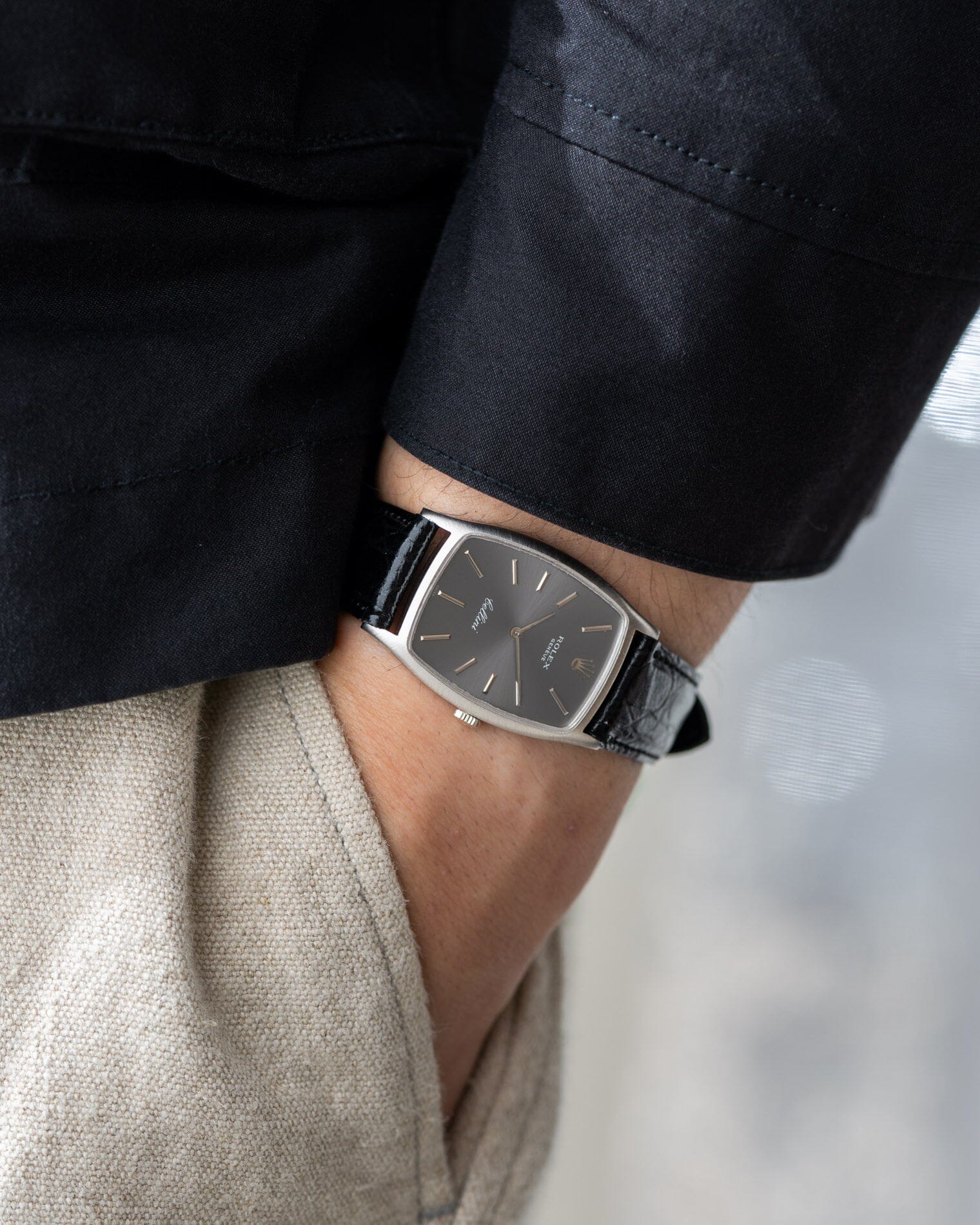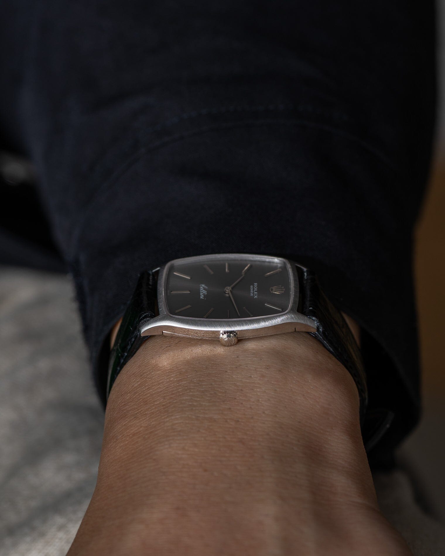 こちらのRef.3807はチェリーニでは珍しいトノー型で、ラグまで一体となったデザインです。ケース素材は18K ホワイトゴールド製。