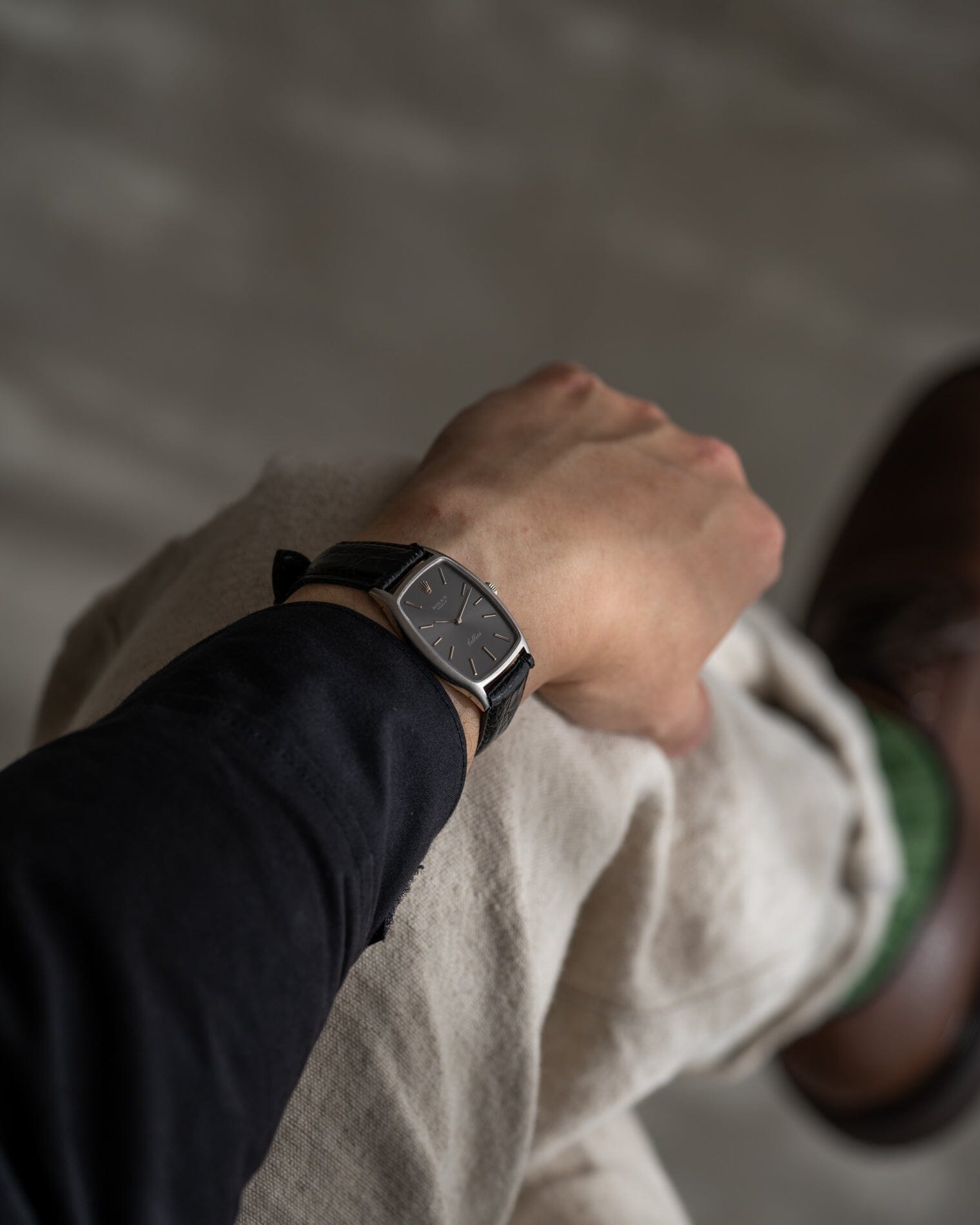 よく見ると前面は中心から放射線状にサテン仕上げがされ、側面はポリッシュ仕上げが施されています。ドレスウォッチらしい、さり気ないですが細やかな拘りが見られます。