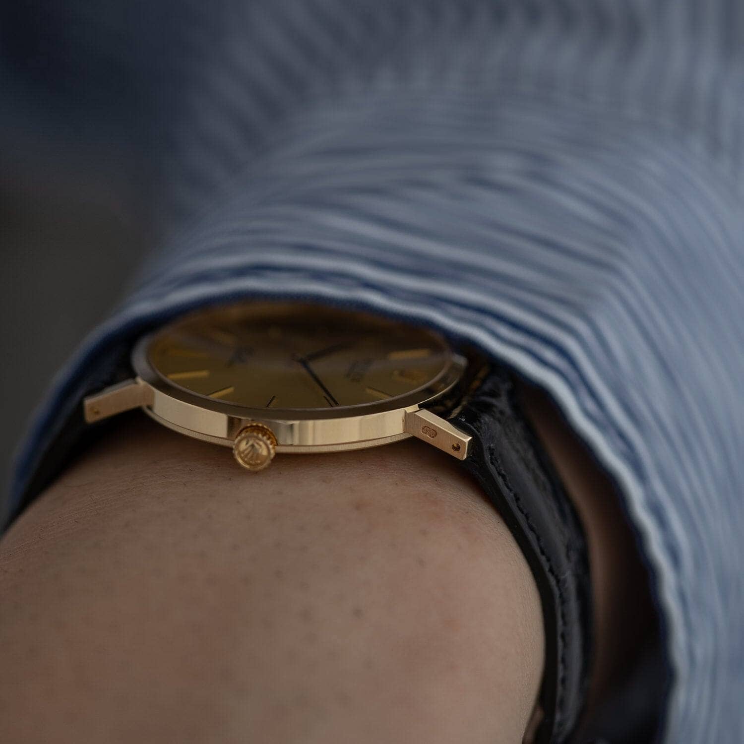 ケース素材は18K イエローゴールド製。ゴールドのケースですが、縁が狭く非常に薄いため主張しすぎるということはありません。