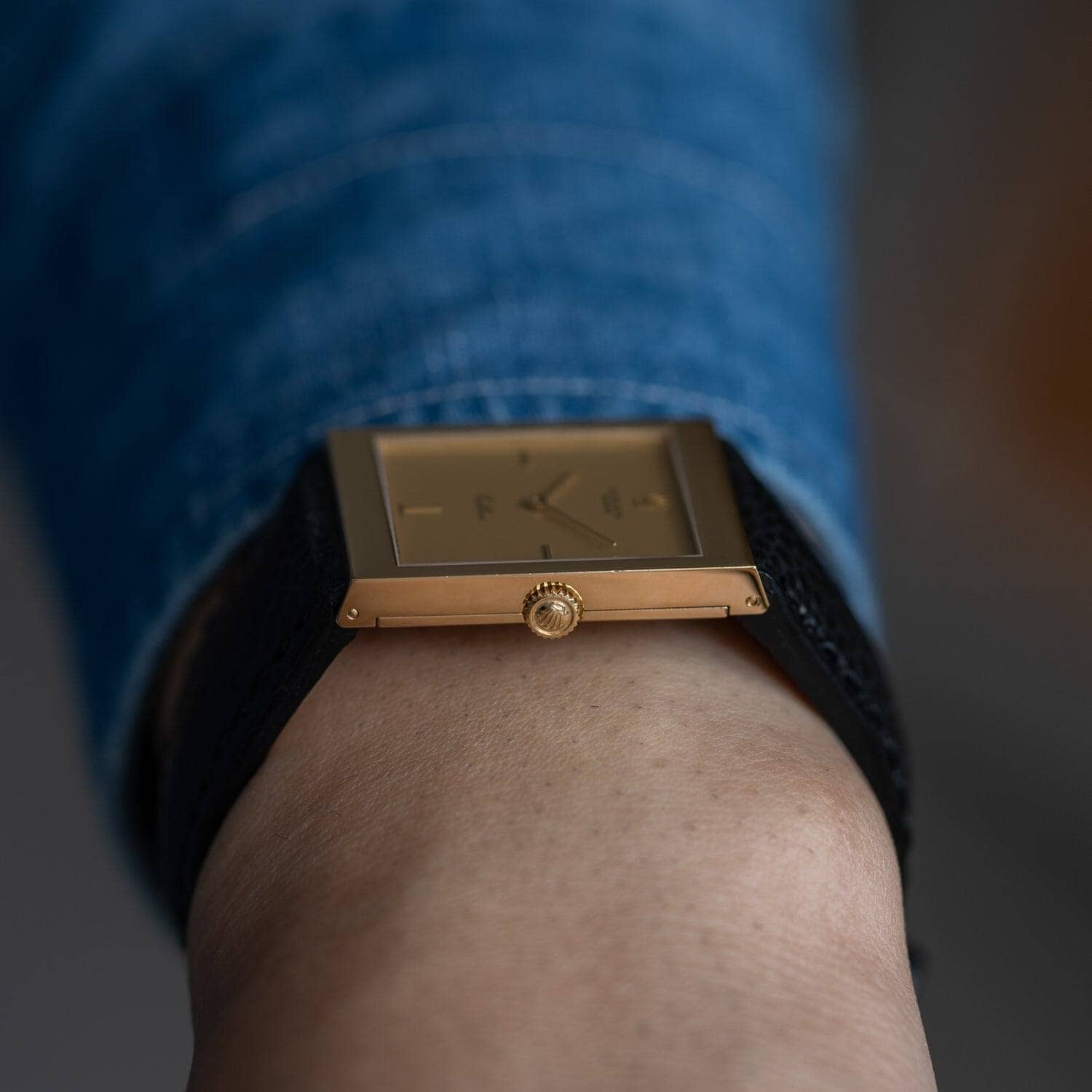 ケースは18K イエローゴールド製で、ケースは横から見るとやや台形のような形をしている変わったデザインです。