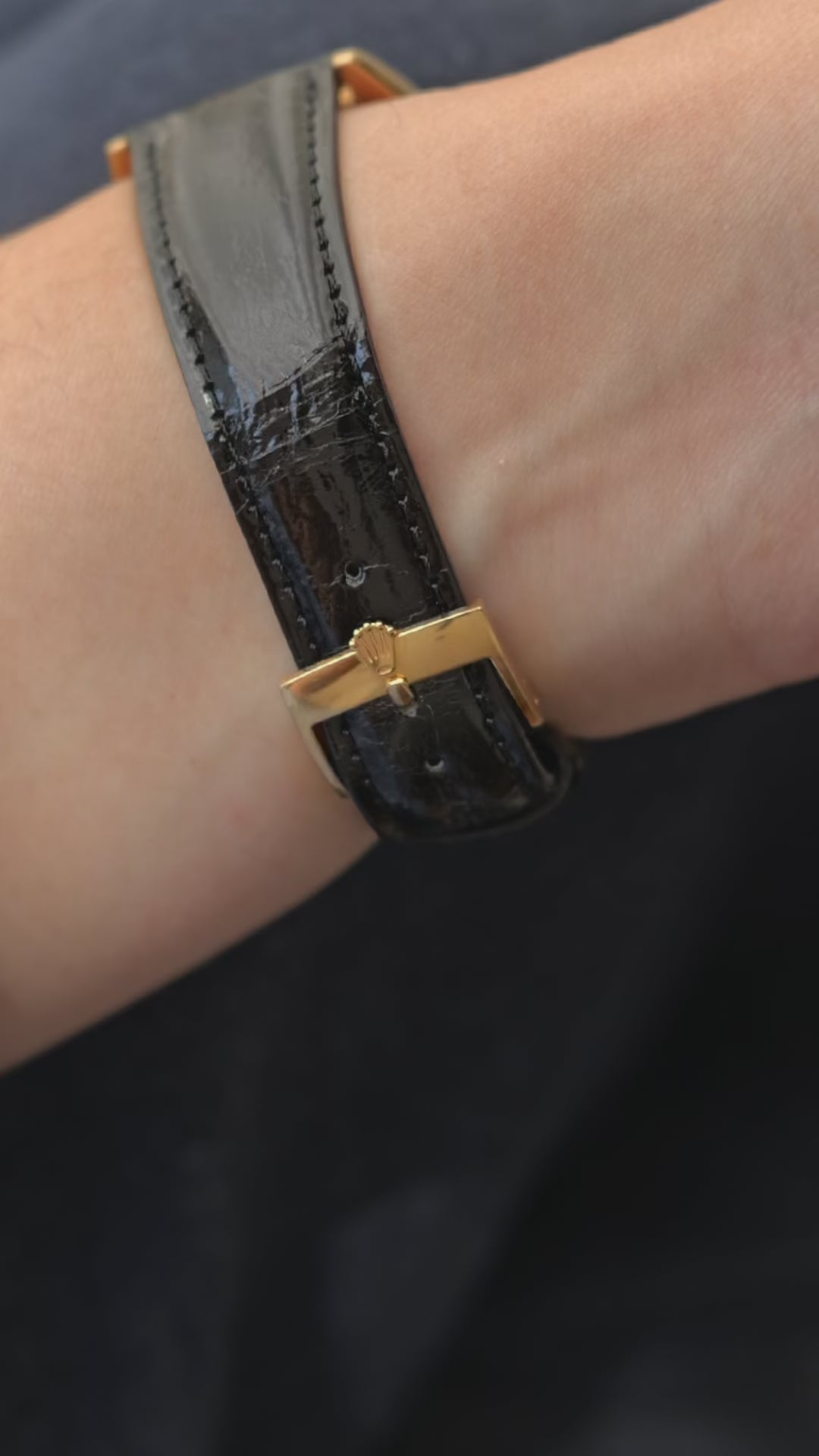 ケースは18Kイエローゴールド製。非常に落ち着いた色合いで、ゴールドの時計ながら目立ち過ぎない印象です。