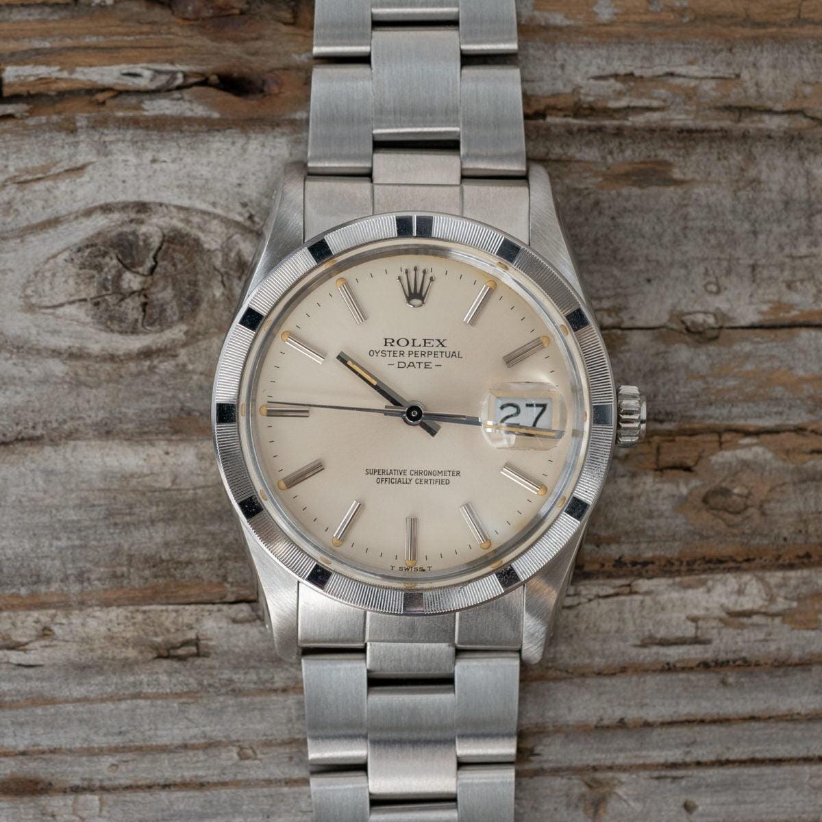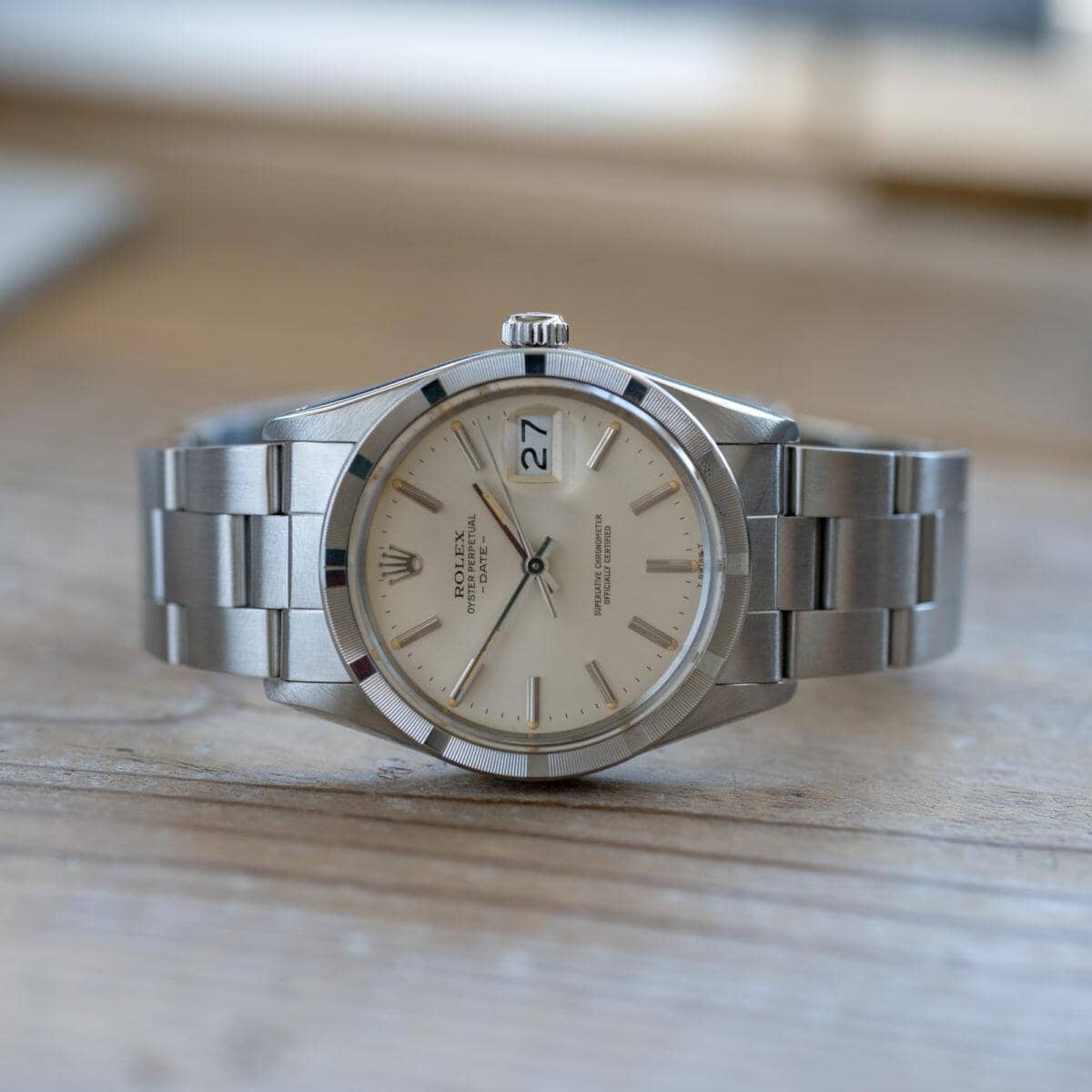エンジンターンドベゼルに小ぶりな34mmケース、そしてアイボリーカラーに変化したダイアルが特徴のオイスターパーペチュアルデイト Ref.15010です。
