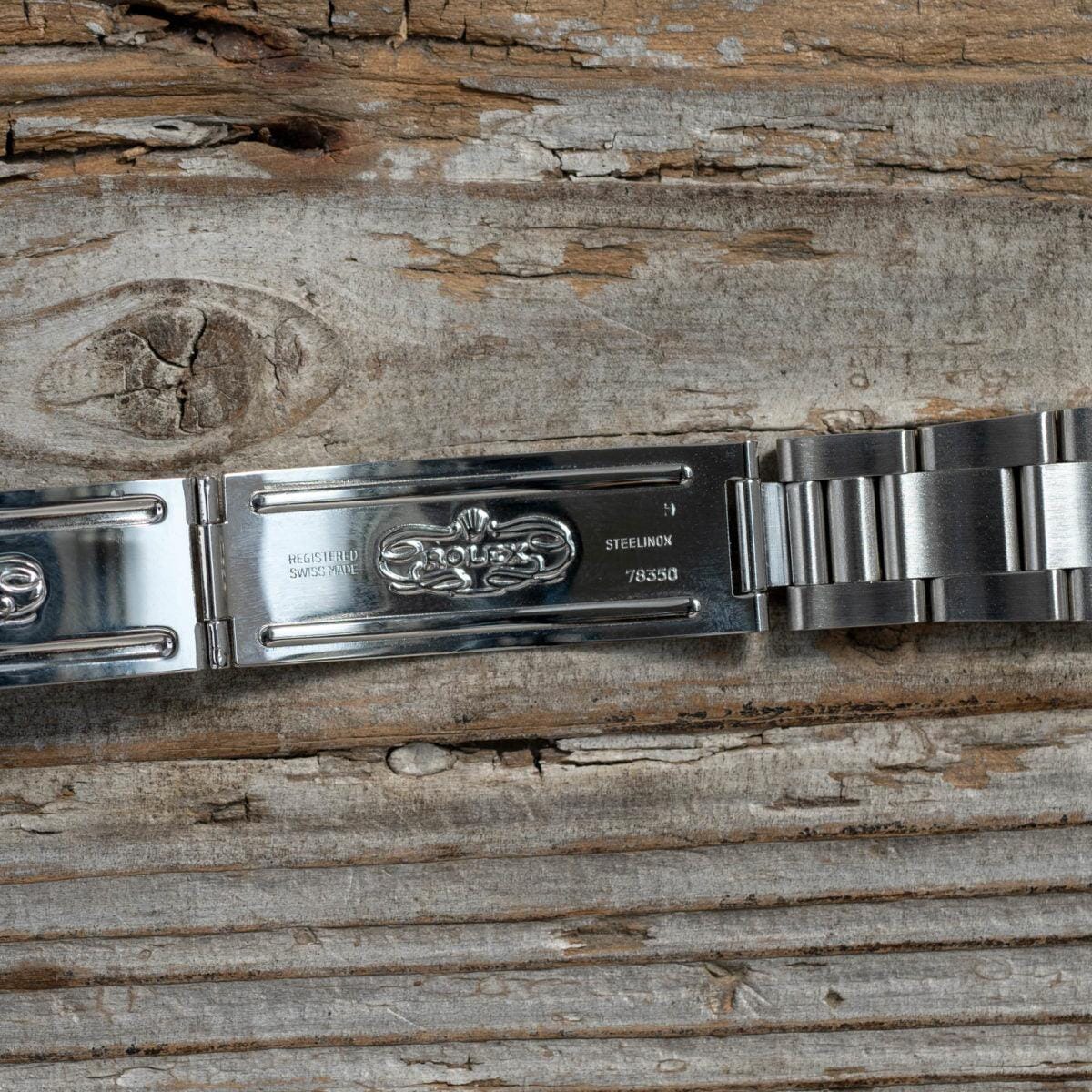 オイスターブレスと呼ばれるハードブレスレットの78350が付属します。こちらはスポーツタイプのロレックス用に作られた頑強なステンレスブレスレットで、リベットや巻きブレスに比べると重さはありますが、その分頑丈な作りで長くお使い頂けます。