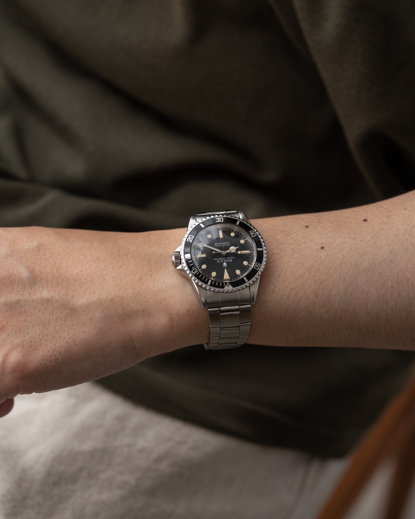 こちらは1970年頃に製造された時計です。文字盤はSINGER社のI型もしくはMK1と呼ばれるマットダイアルです。ft表記が先に来るため「フィートファースト」やSubmarinerの表記が下段にあることから「下サブ」とも言われます。