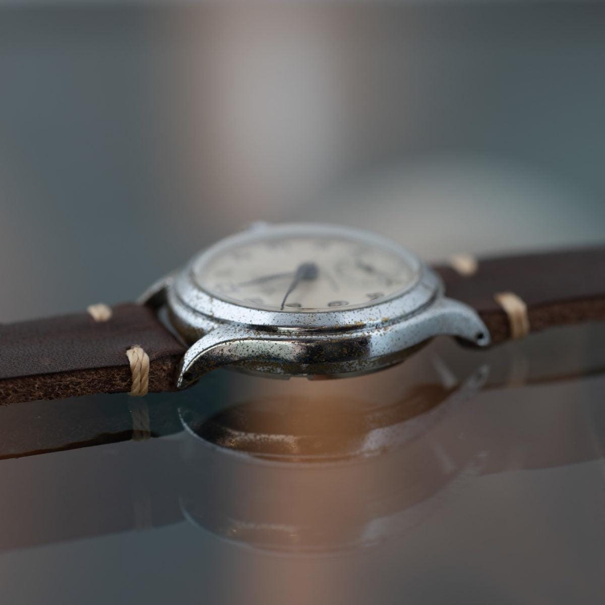 ケースは真鍮にクロームメッキ、裏蓋はこの時代では珍しいステンレススティールのスクリューバックとなっています。ヴィンテージ感満載でかなり渋い時計ですね。