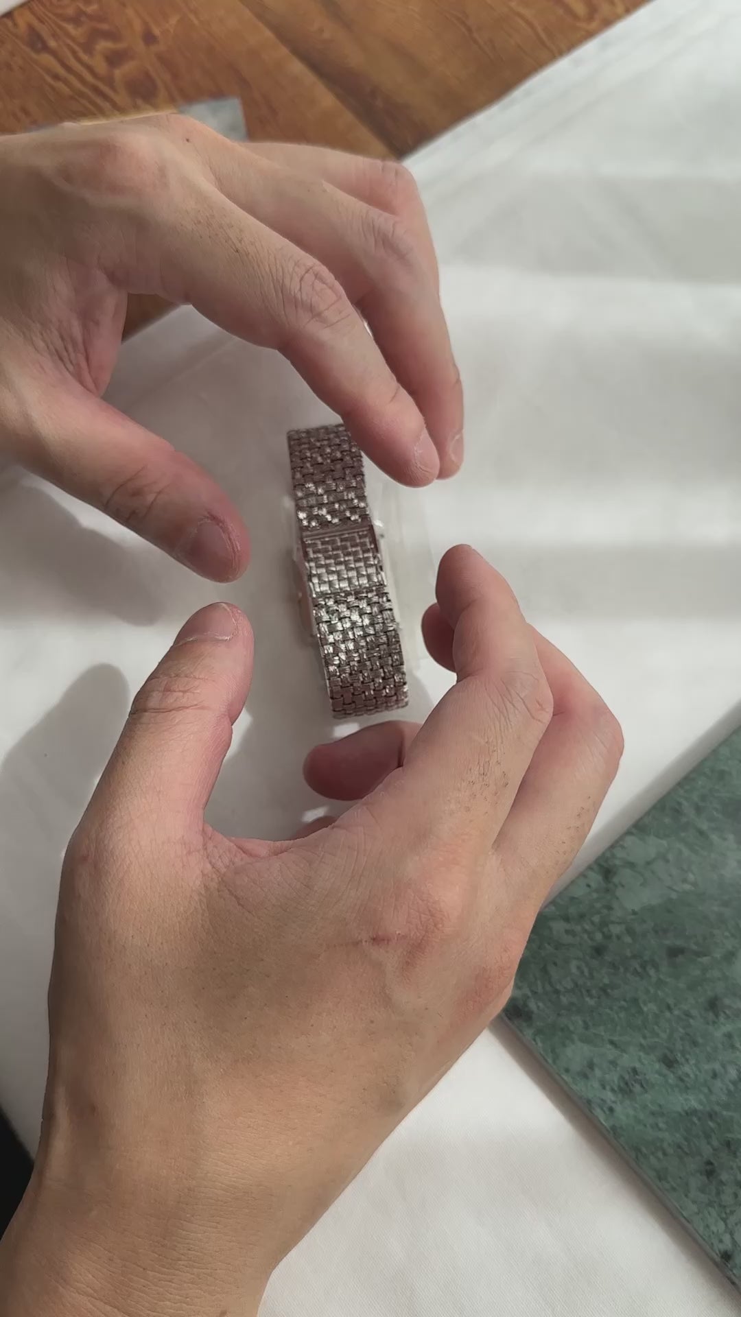 ブレスレットもケースと同じホワイトゴールド製でケースと一体となったデザインです。ケースとは異なり、ブレスレットにはバーク仕上げが施された編み込み構造をしています。